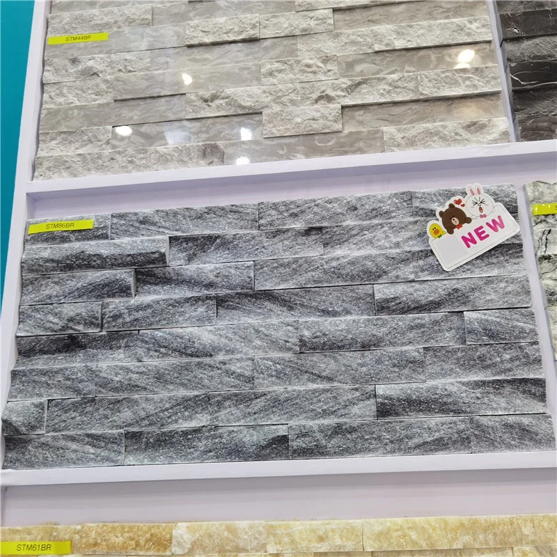 بلاط جدران الحجر الكوارتي الثقافي الخارجي الزخرفي الرخيص البازلت المكدس الطبيعي المقطوع حسب الطلب بسمك 10-12 مم وأبعاد 600 × 150 مم