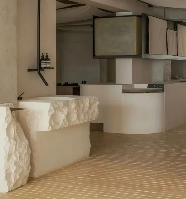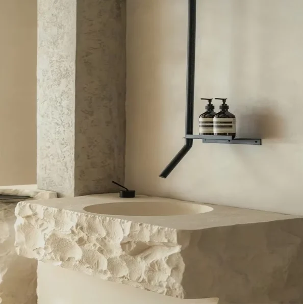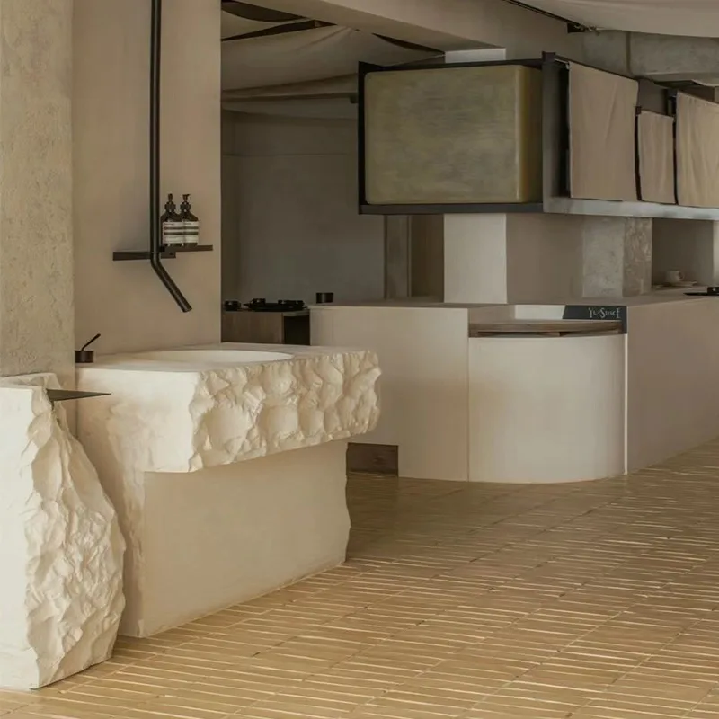 Съвременна бежова вана за баня от вулканичен камък, полирани плочки, антични матови плочки с форма на гъба за външно използване, кухня, вила, вана за баня