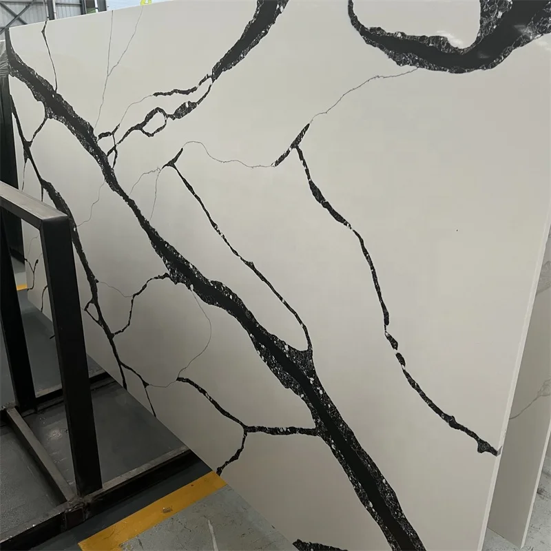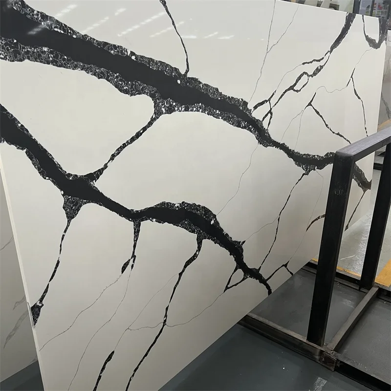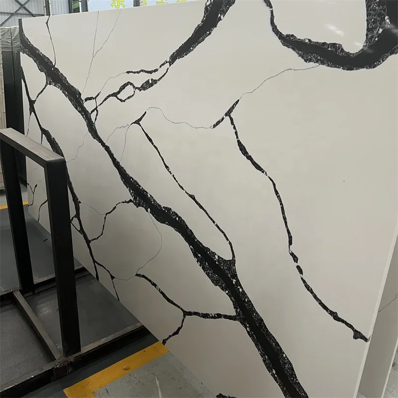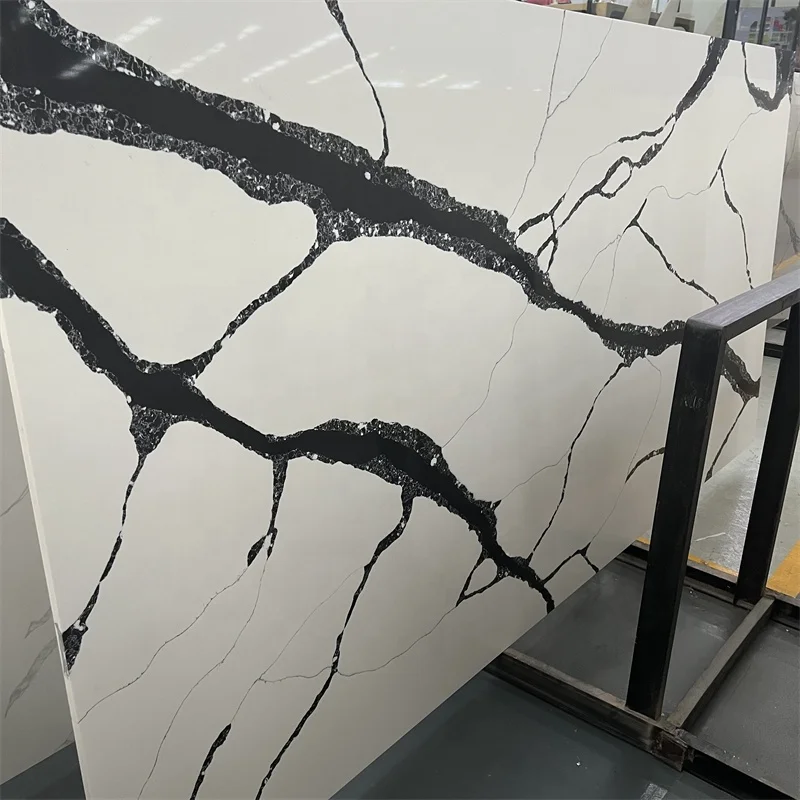 Høj kvalitet Calacatta Sort Kvartsstensplade Hvid Kvartssten med Sorte Aderner til Køkkendesign