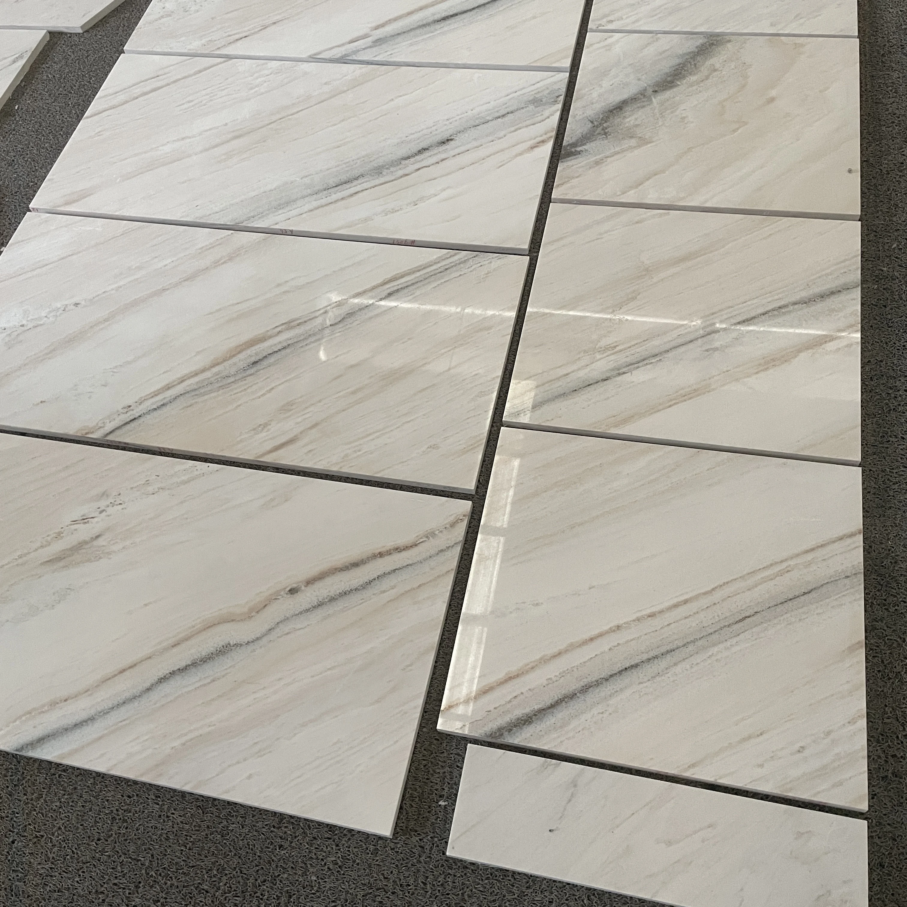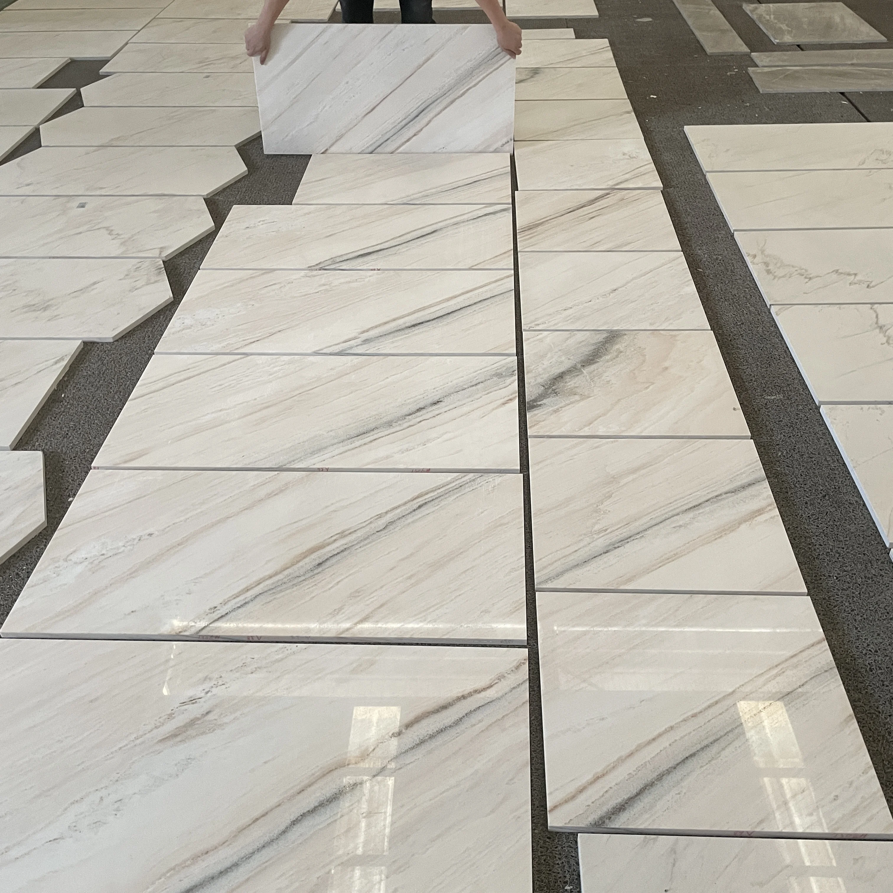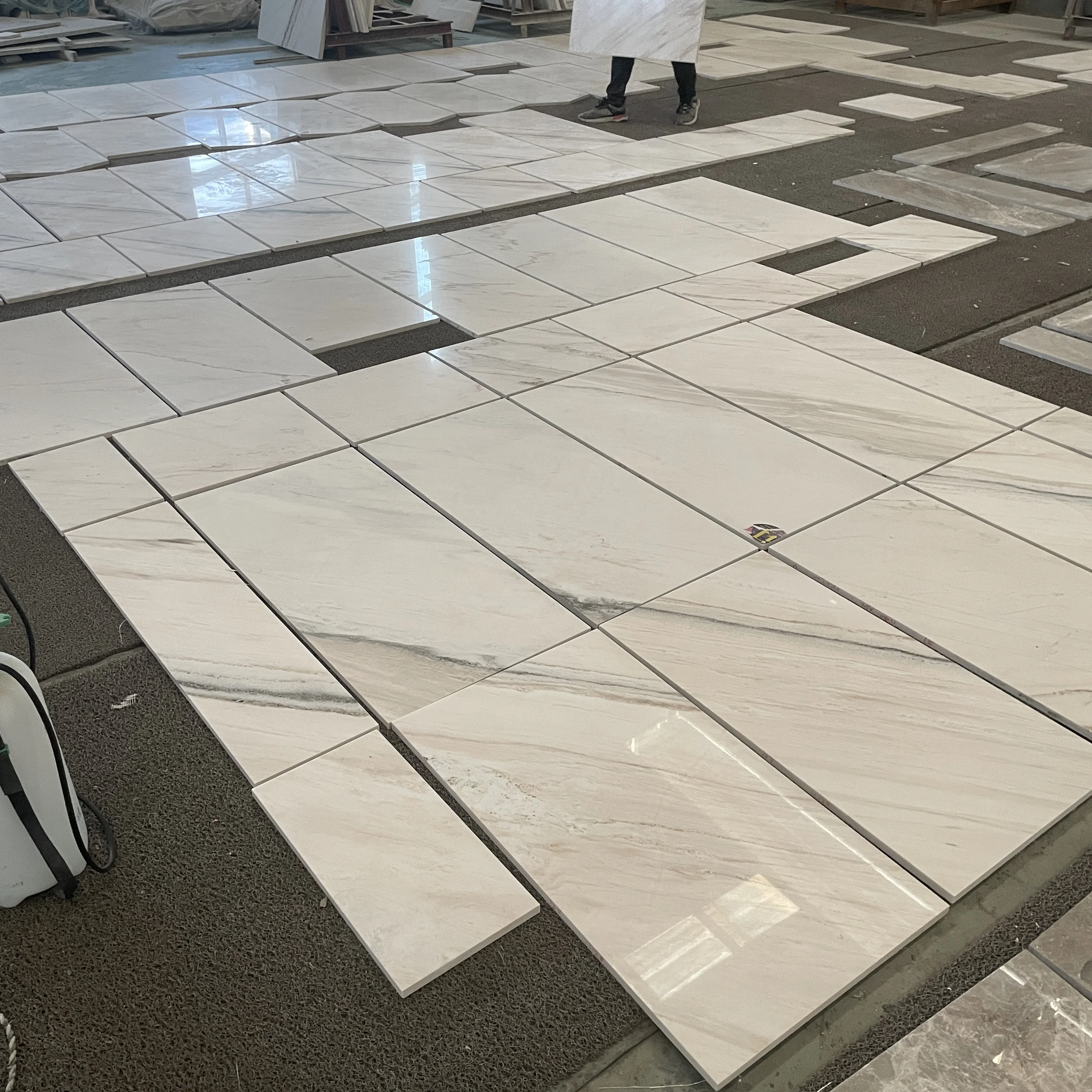 Indendørs dekoration: gulvfliser 600x600 mm samt skiver i hvid marmor