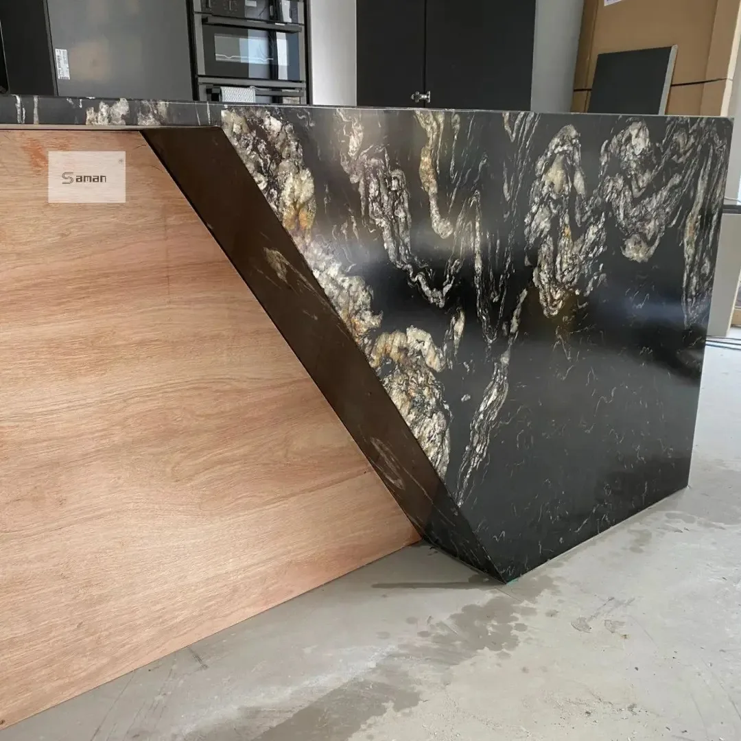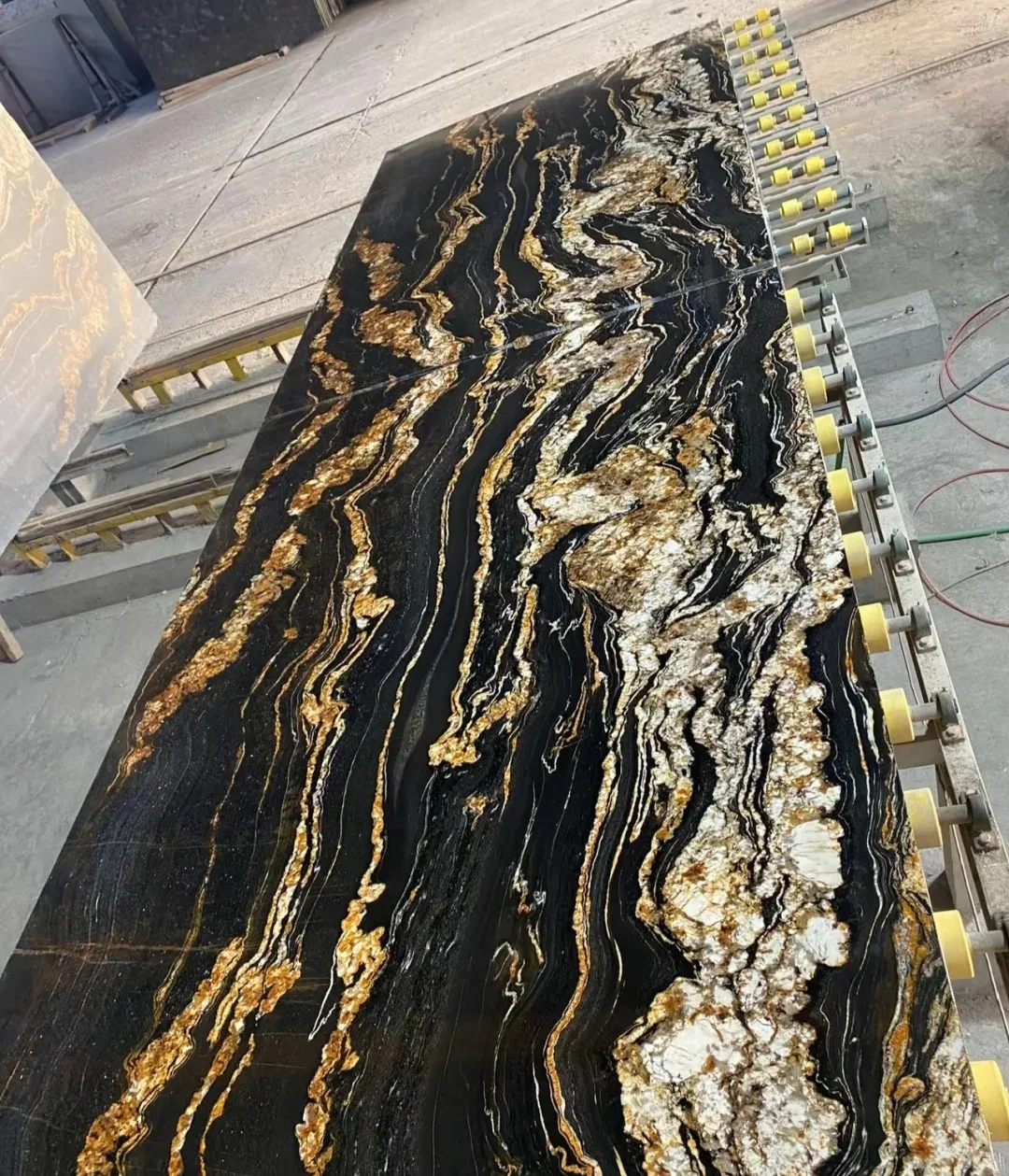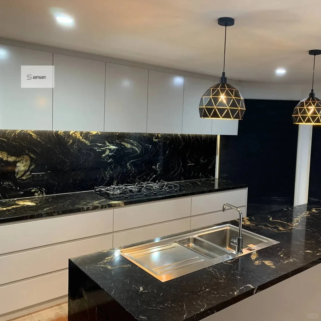 Losa de mármol Magma negro dorado pulido de primera calidad para decoración de encimeras de cocina con mármol negro y veta dorada. Producto de mármol.