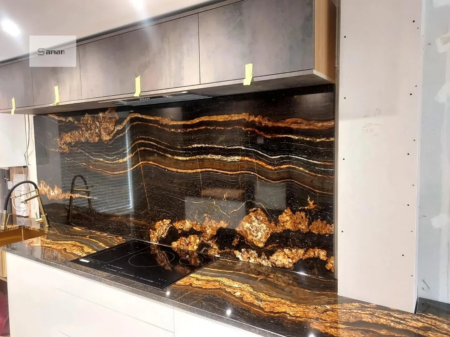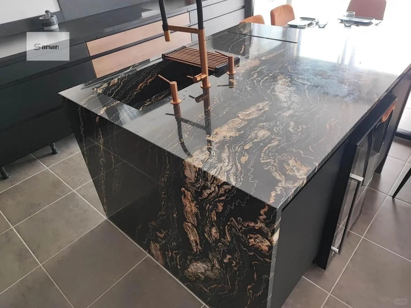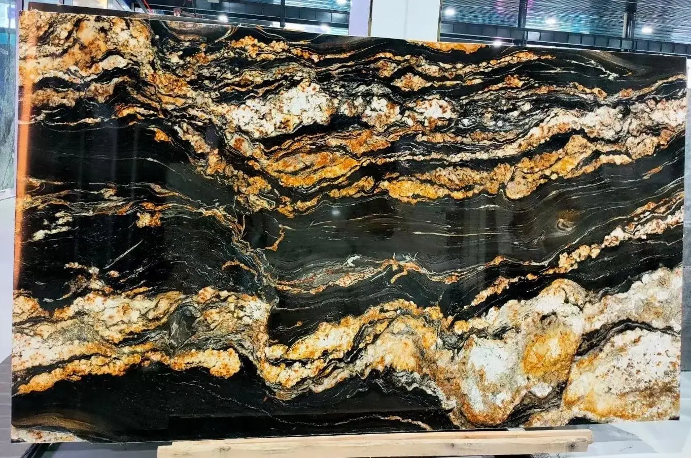 Losa de mármol Magma negro dorado pulido de primera calidad para decoración de encimeras de cocina con mármol negro y veta dorada. Producto de mármol.