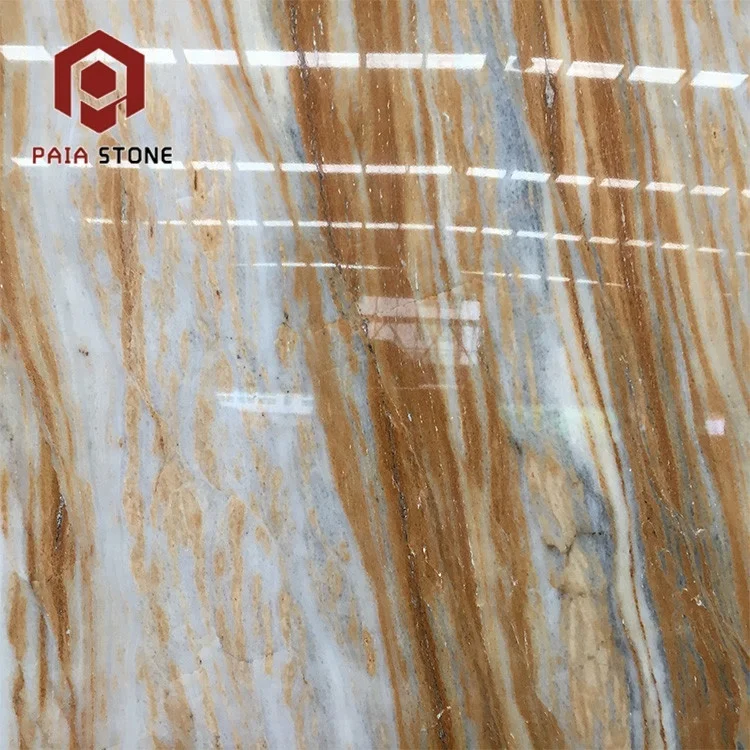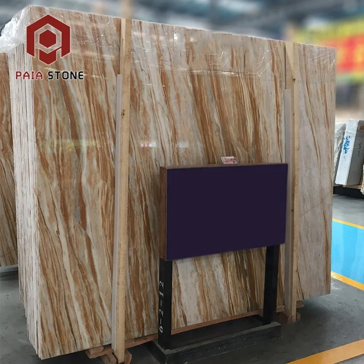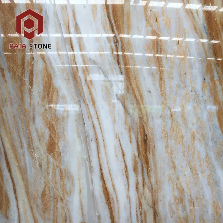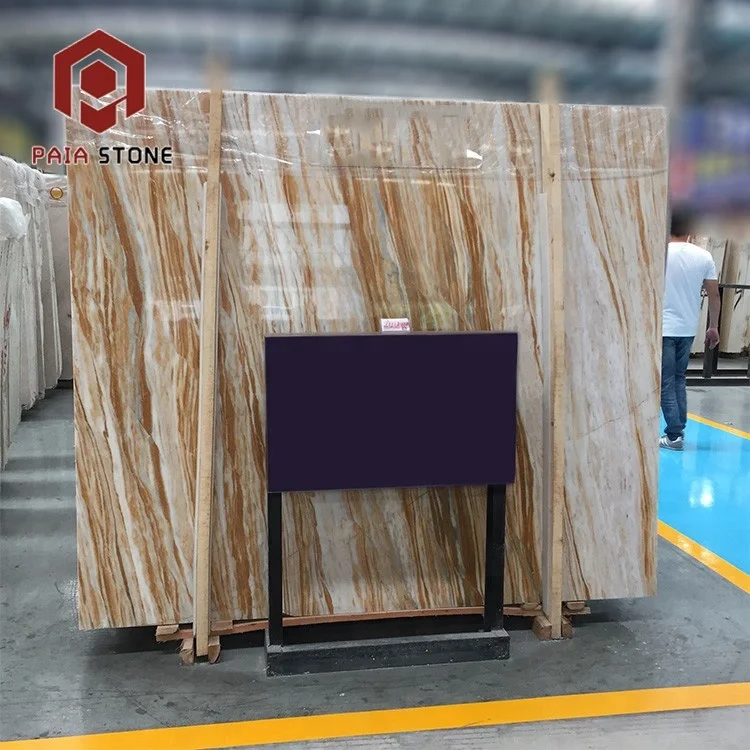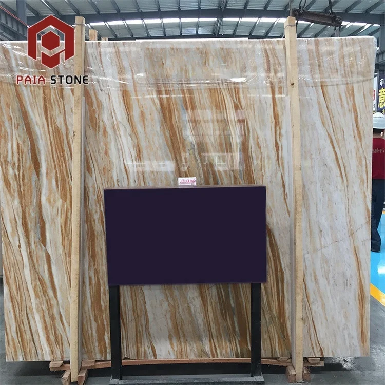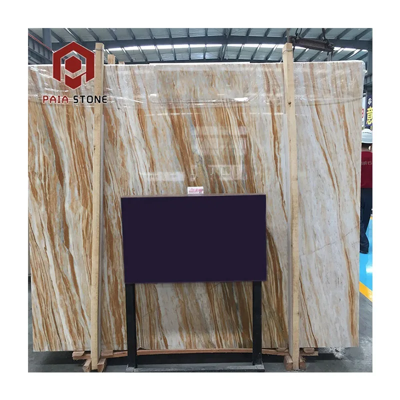 Plaque en marbre jaune doré poli avec veines dorées, style luxueux pour revêtements muraux et sols d’intérieur