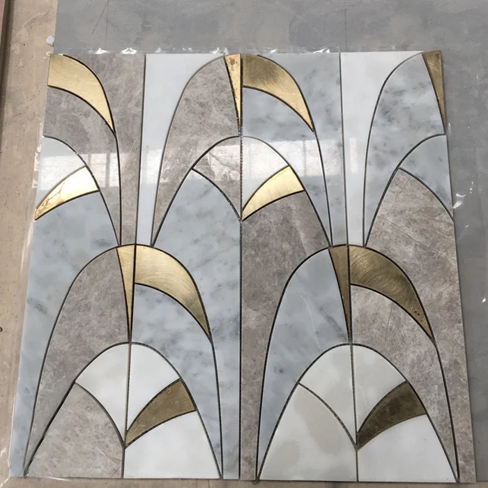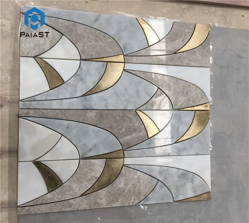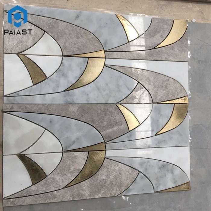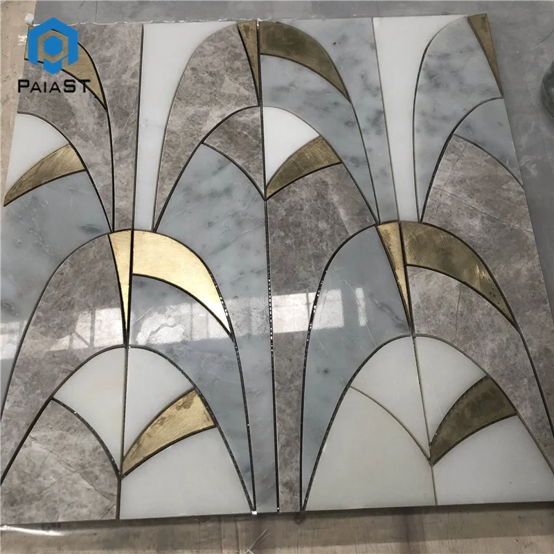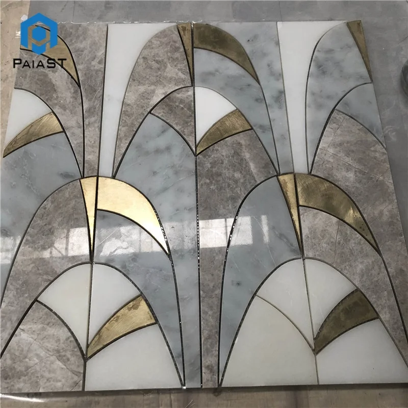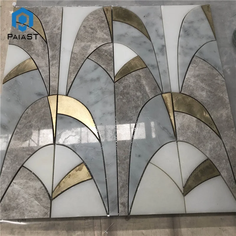 कस्टम डिज़ाइन वॉटर-जेट पैटर्न वाला संगमरमर, ब्रास मोज़ेक के साथ ग्रे संगमरमर की वॉल टाइल्स