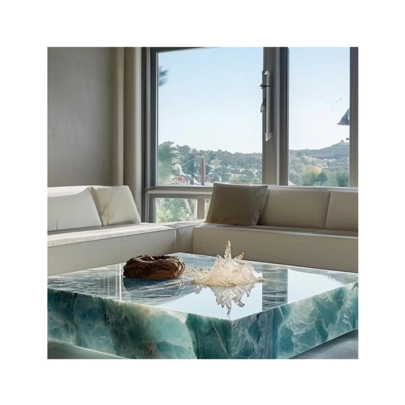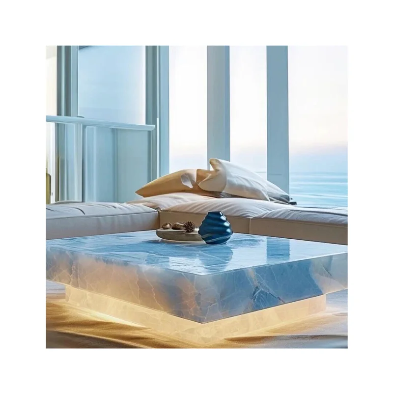 पॉलिश किया गया नीला ऑनिक्स, बिना ड्रॉअर के कॉफी टेबल, यूफोटिक आयताकार प्राकृतिक पत्थर, 1000x1000x380 मिमी या कस्टम आकार, आधुनिक मार्बल