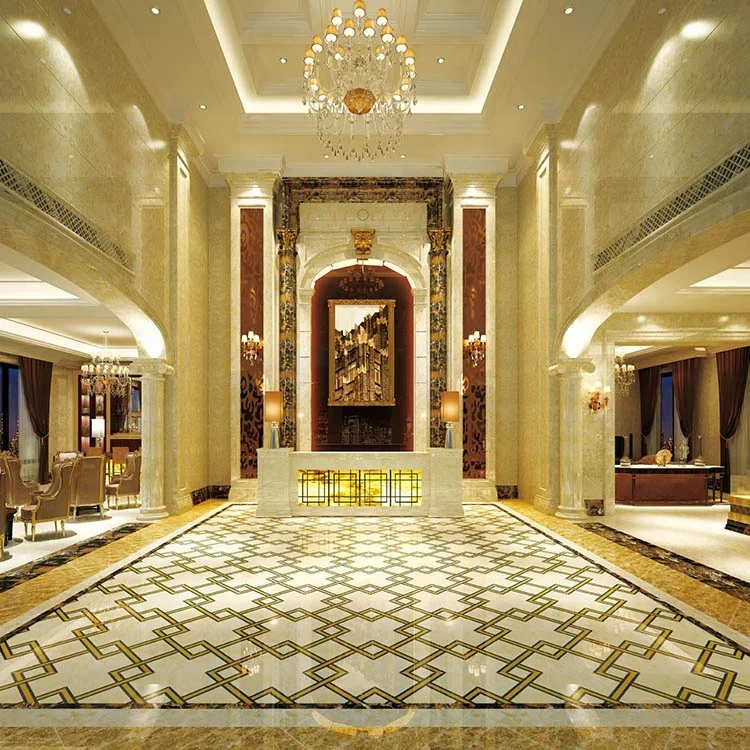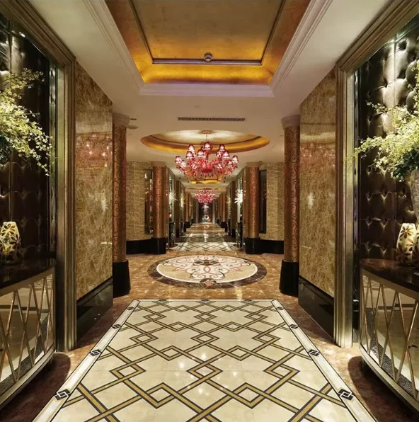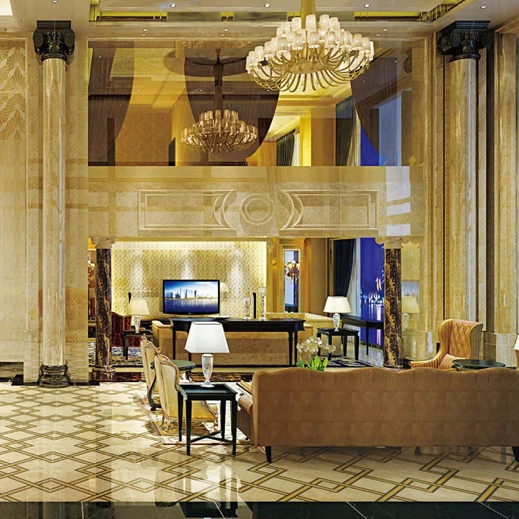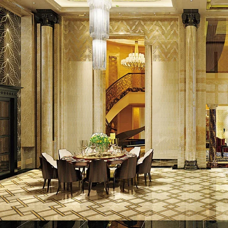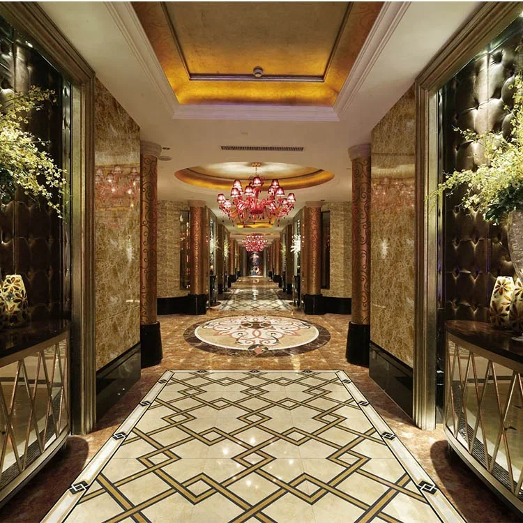 מדליונים וגבולות קלאסיים-מודרניים ממרבד מאבן גיר בעיבוד גז חם, מסיימים בברק, למסדרונות מעוצבים כעצי עץ ולמרצפות חוץ/פנים בווילות