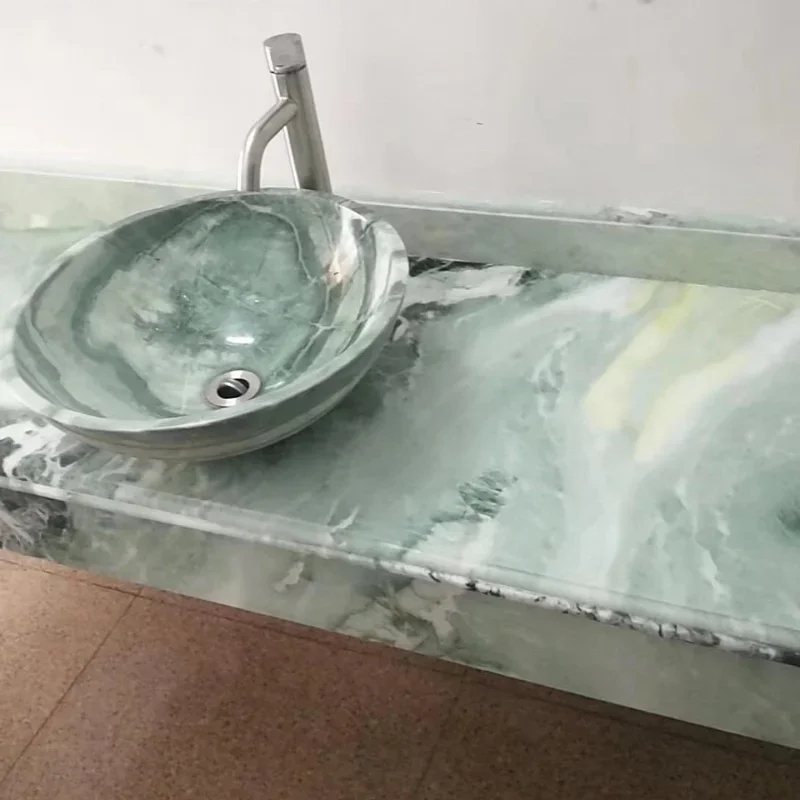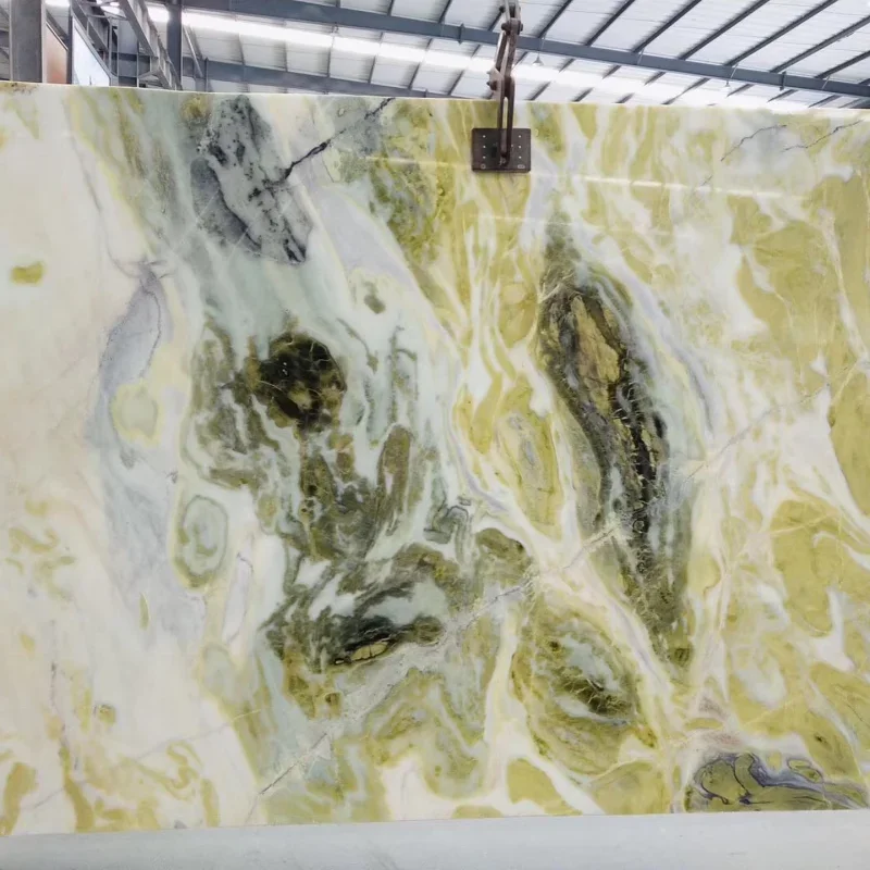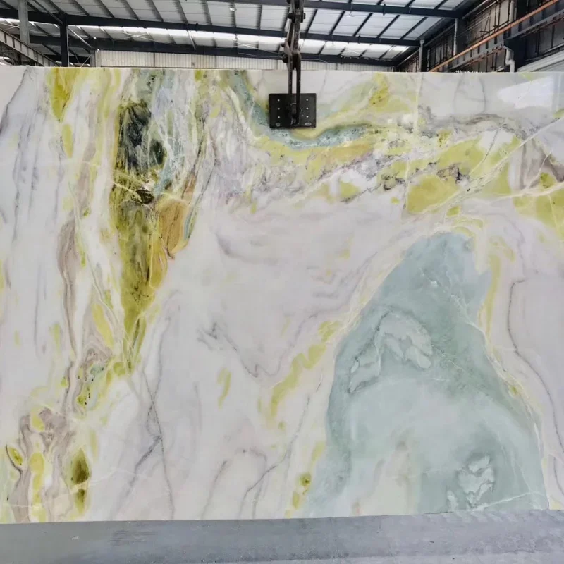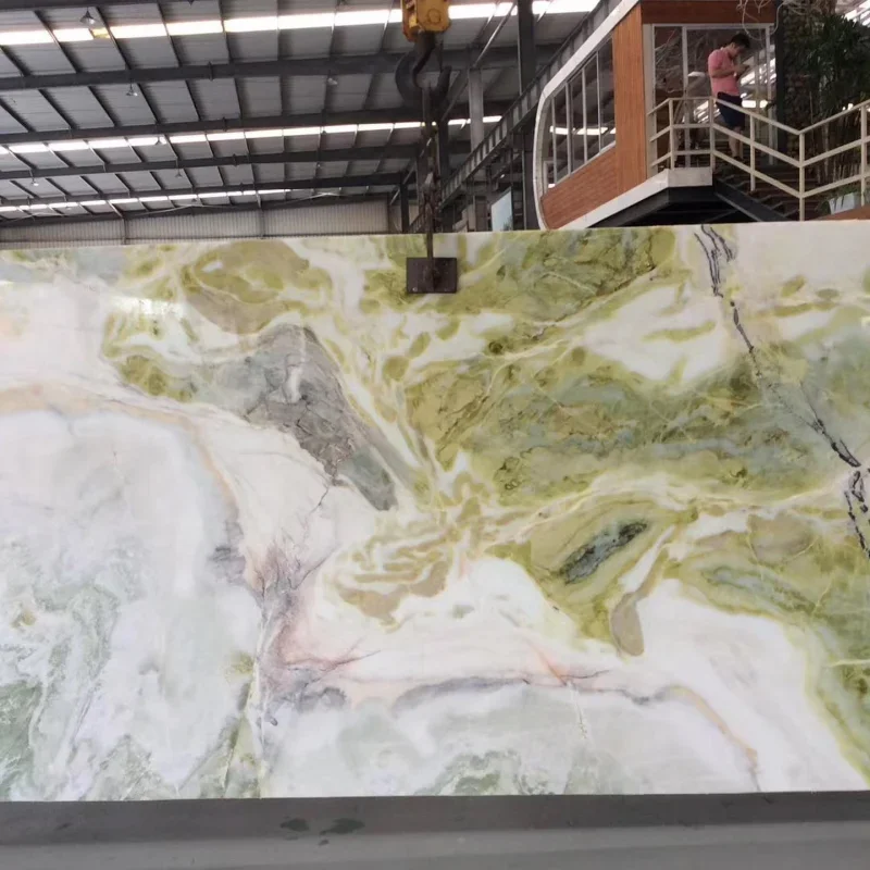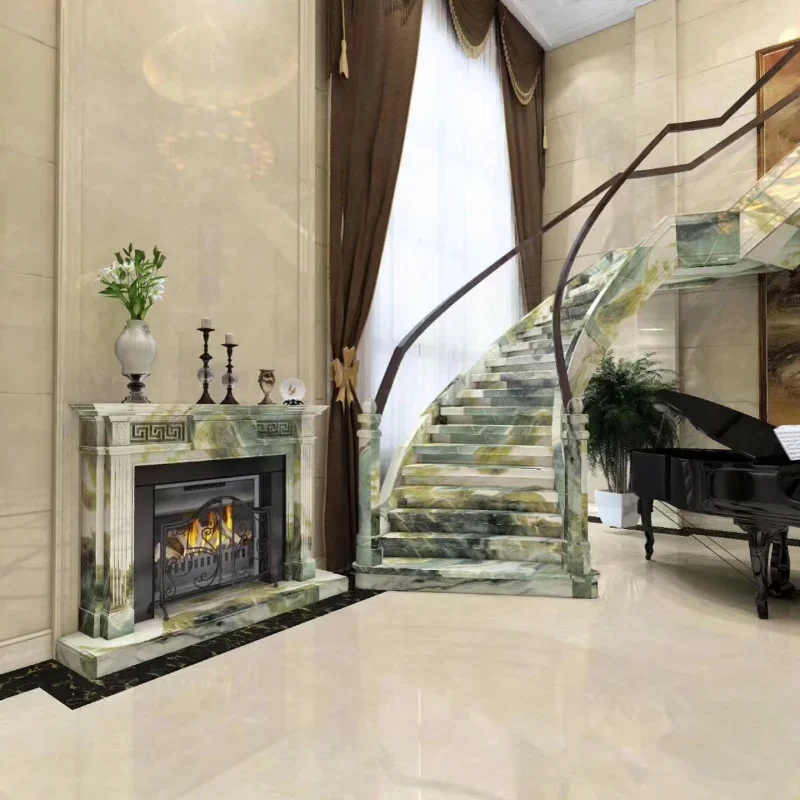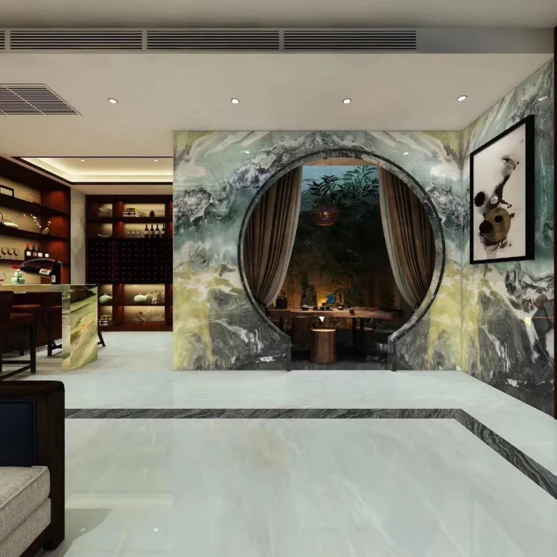לוחות מרמר מומשחים בצבע ירוק אגוזי מעורבב בלבן, לרצפה ולקירות בבית