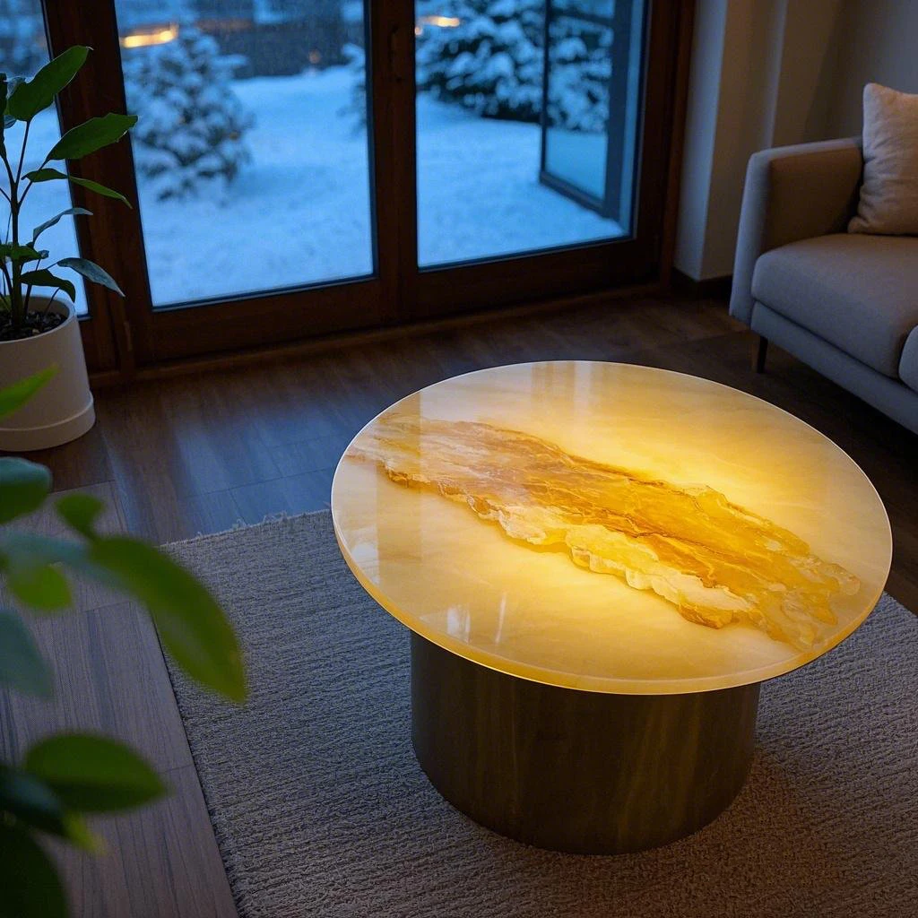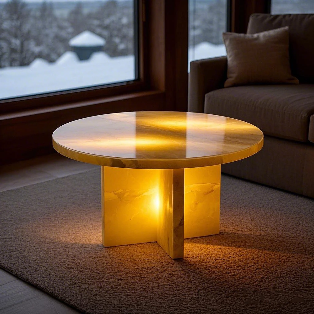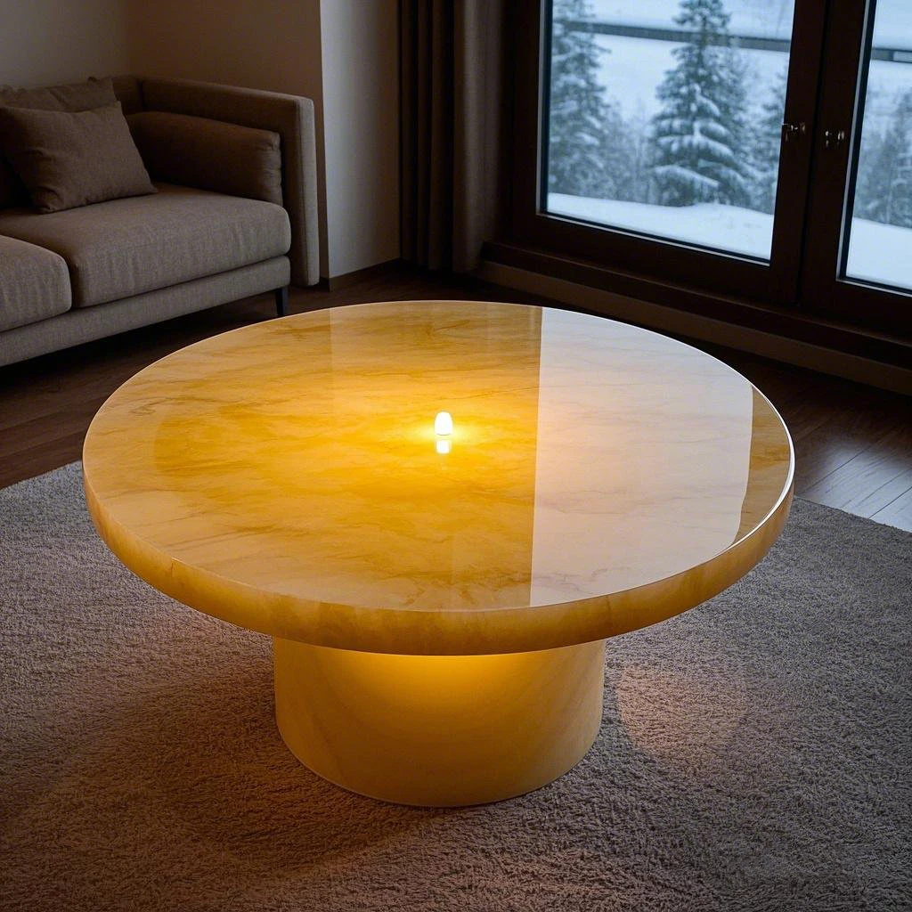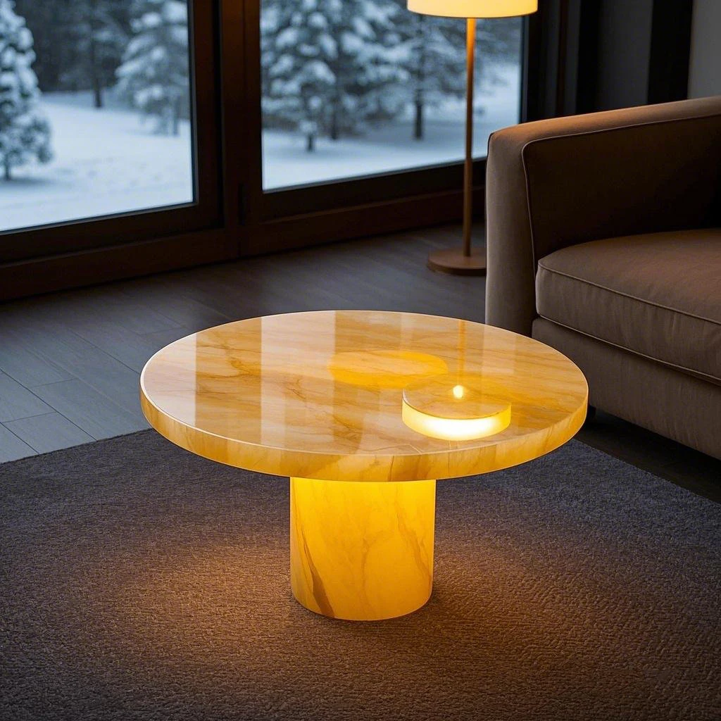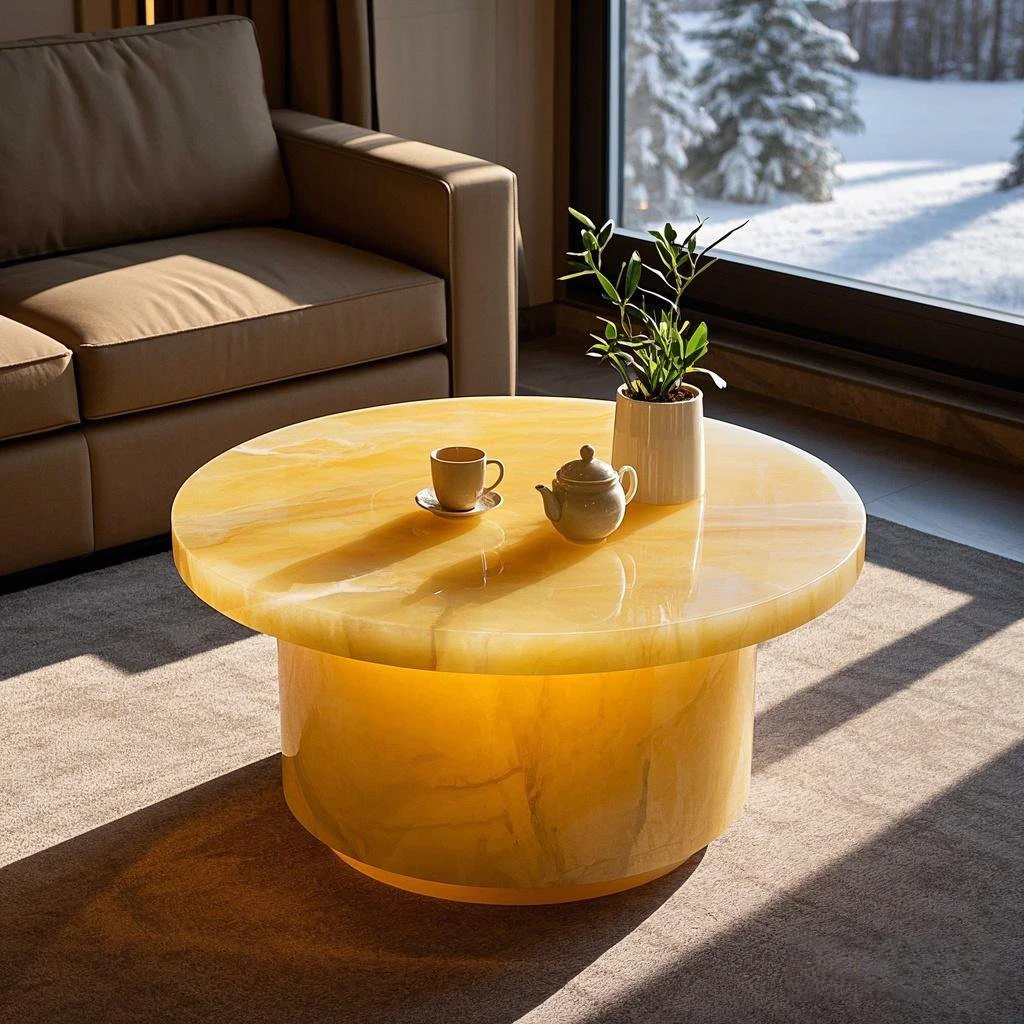 Თანამედროვე ბუნებრივი ყვითელი ჯეიდის ონიქსის მარმარილოს კოფე მაგიდა, გამჭვირვალე აგატის შიგნით გამოყენების ავეჯი საცხოვრებლის ოთახისთვის