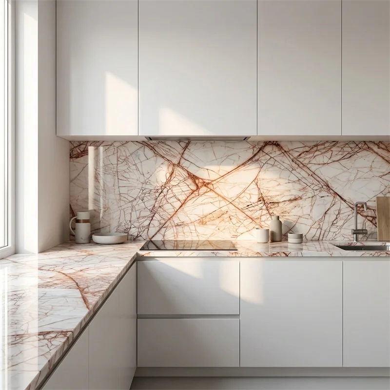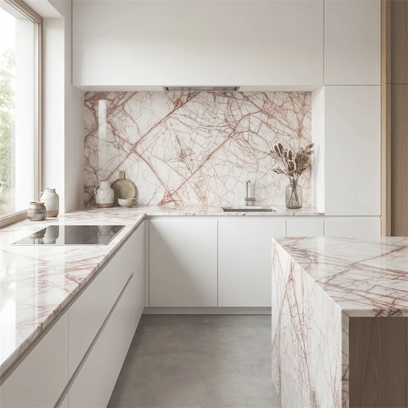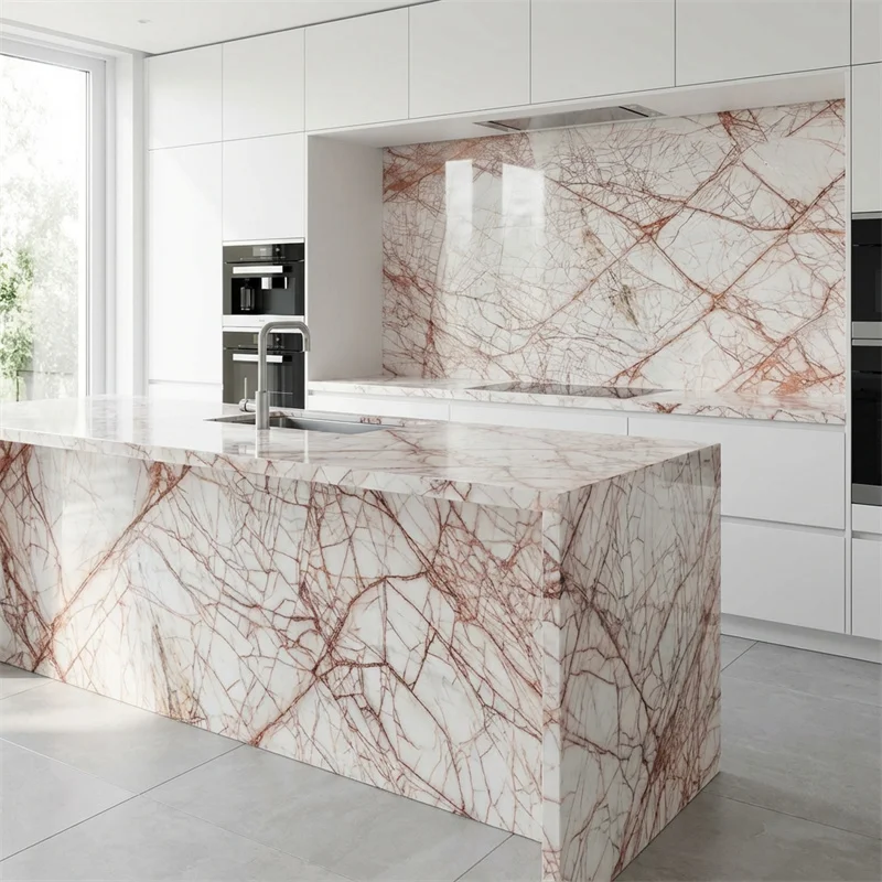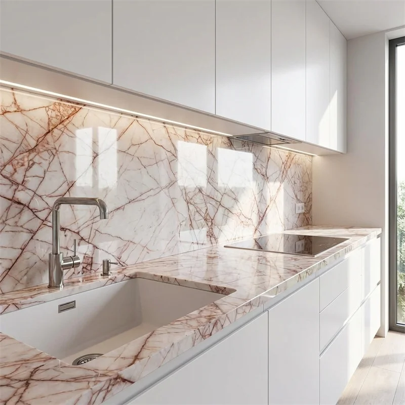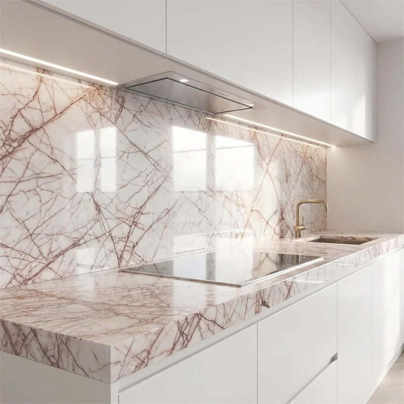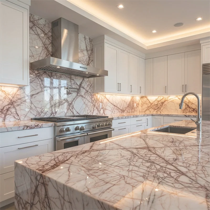 Ნატურალური ქვის პოლირებული თეთრი მარმარილოს გვერდითი ზედაპირი, მარმარილოს მაგიდა სამზარეულოს სავარდნისთვის
