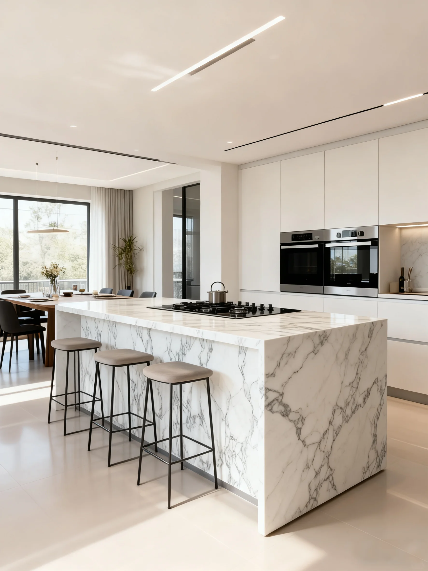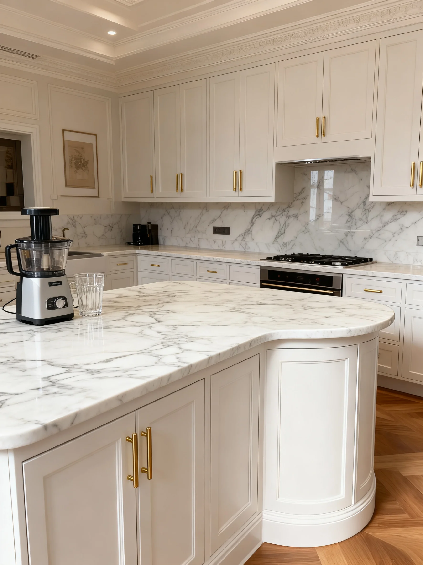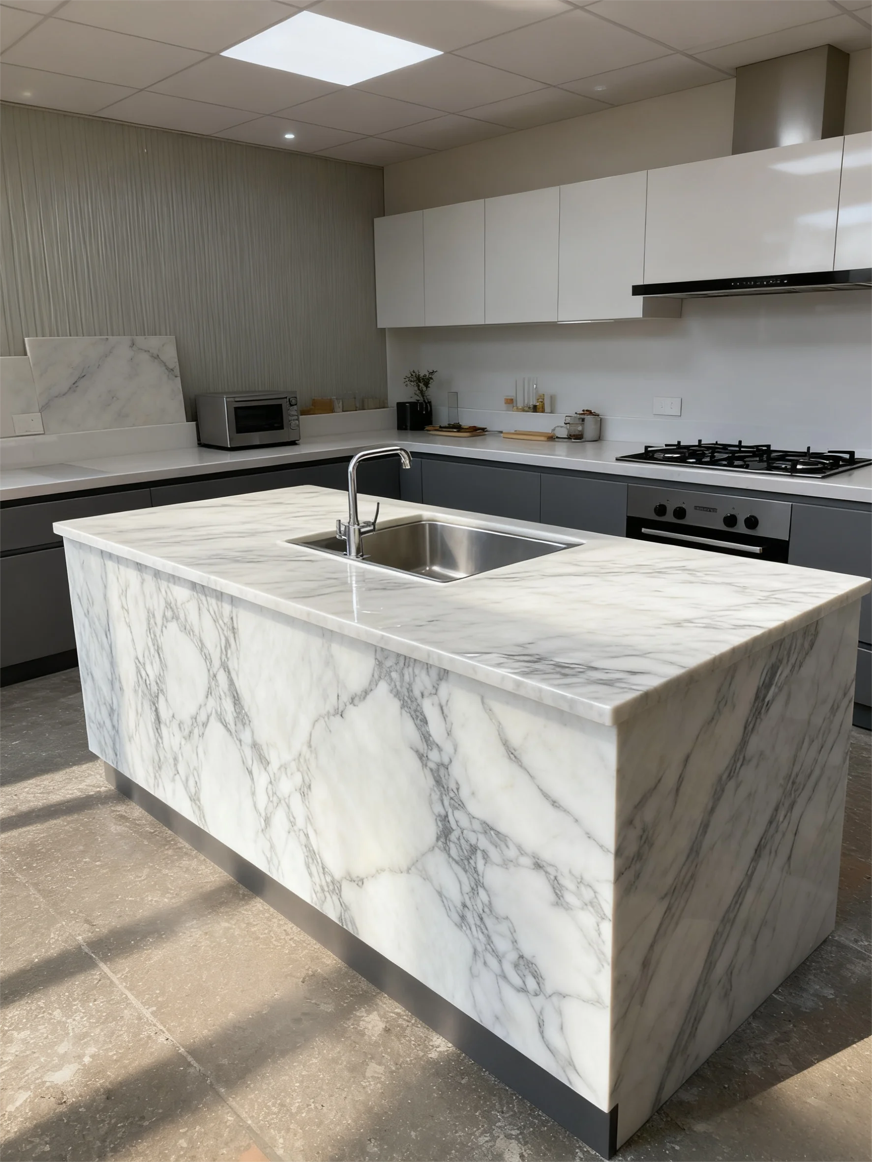 ថ្មម៉ាបលខៀវស អារ៉ាបេស្កាតូ ការ៉ារ៉ា គឺជាជម្រើសបុរាណ និងគ្មានកាលកំណត់សម្រាប់រចនាផ្ទះបាយណាមួយ ពីទំនើប រហូតដល់បែបបុរាណ។ ដោយមានផ្ទៃខាងក្រោយពណ៌ស និងរ៉ែពណ៌ប្រផេ្រងដ៏អាណិតអាសូរ ថ្មនេះបន្ថែមនូវភាពប្រណីត និងសោភ័ណភាពដល់រចនាប័ទ្មផ្ទះបាយរបស់អ្នក