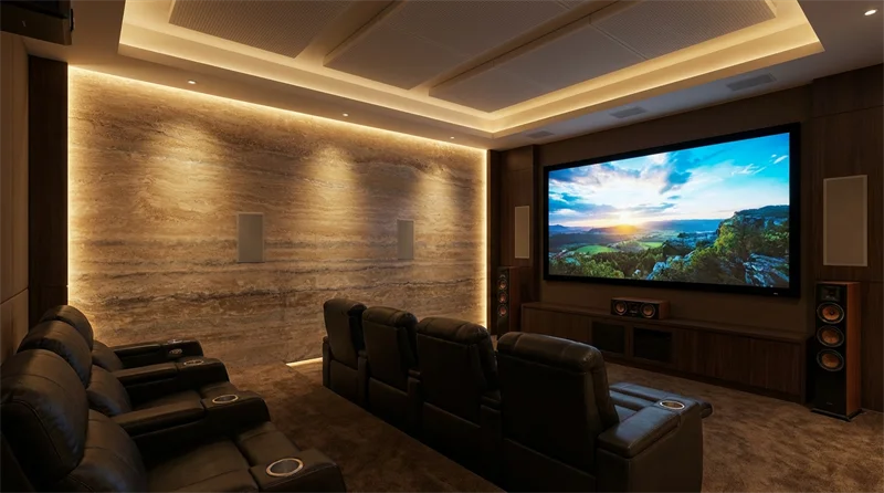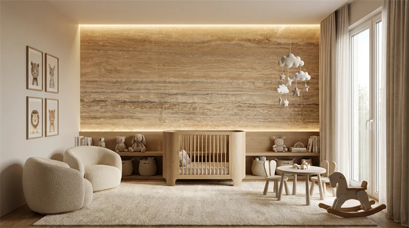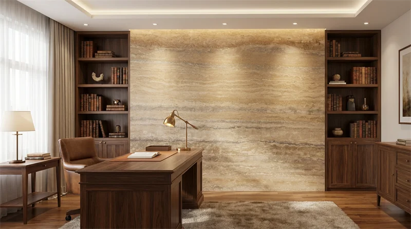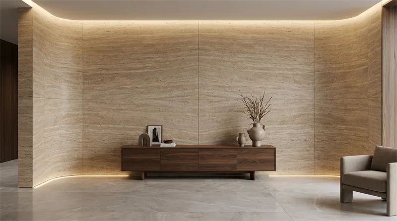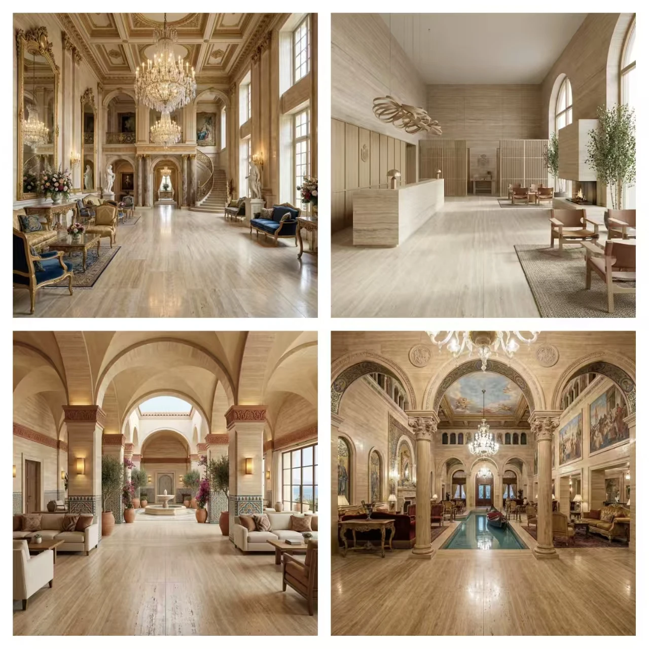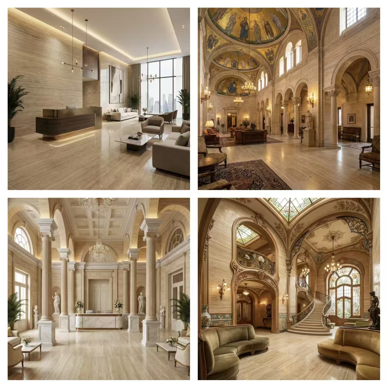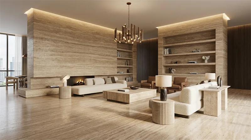 Lapis Naturalis Myra Beige Travertini Modernae Villae Intus et Foris Superficiei Levigatae Politi pro Convivii Loco Travertino Lapidis Designatione