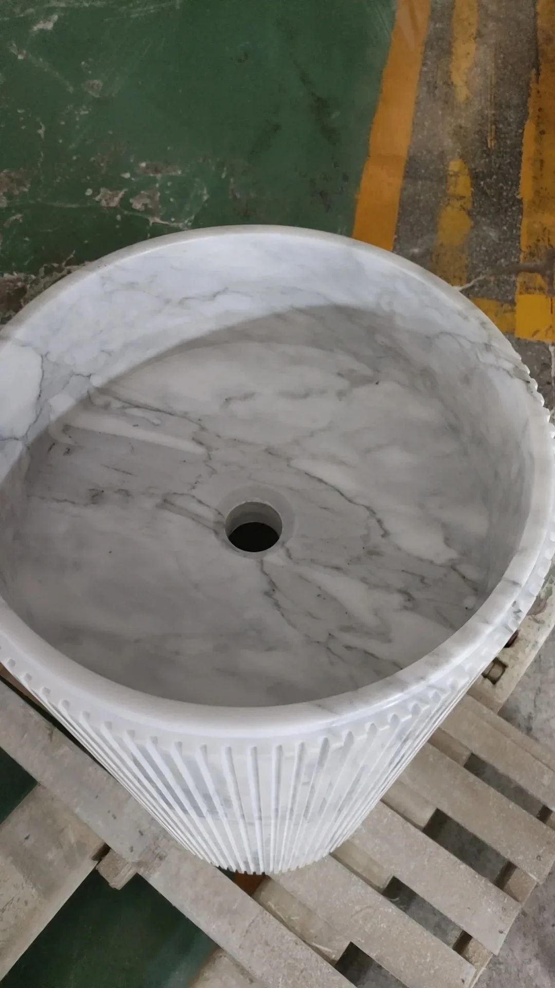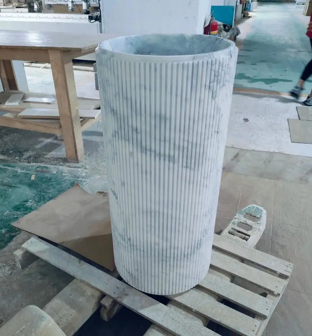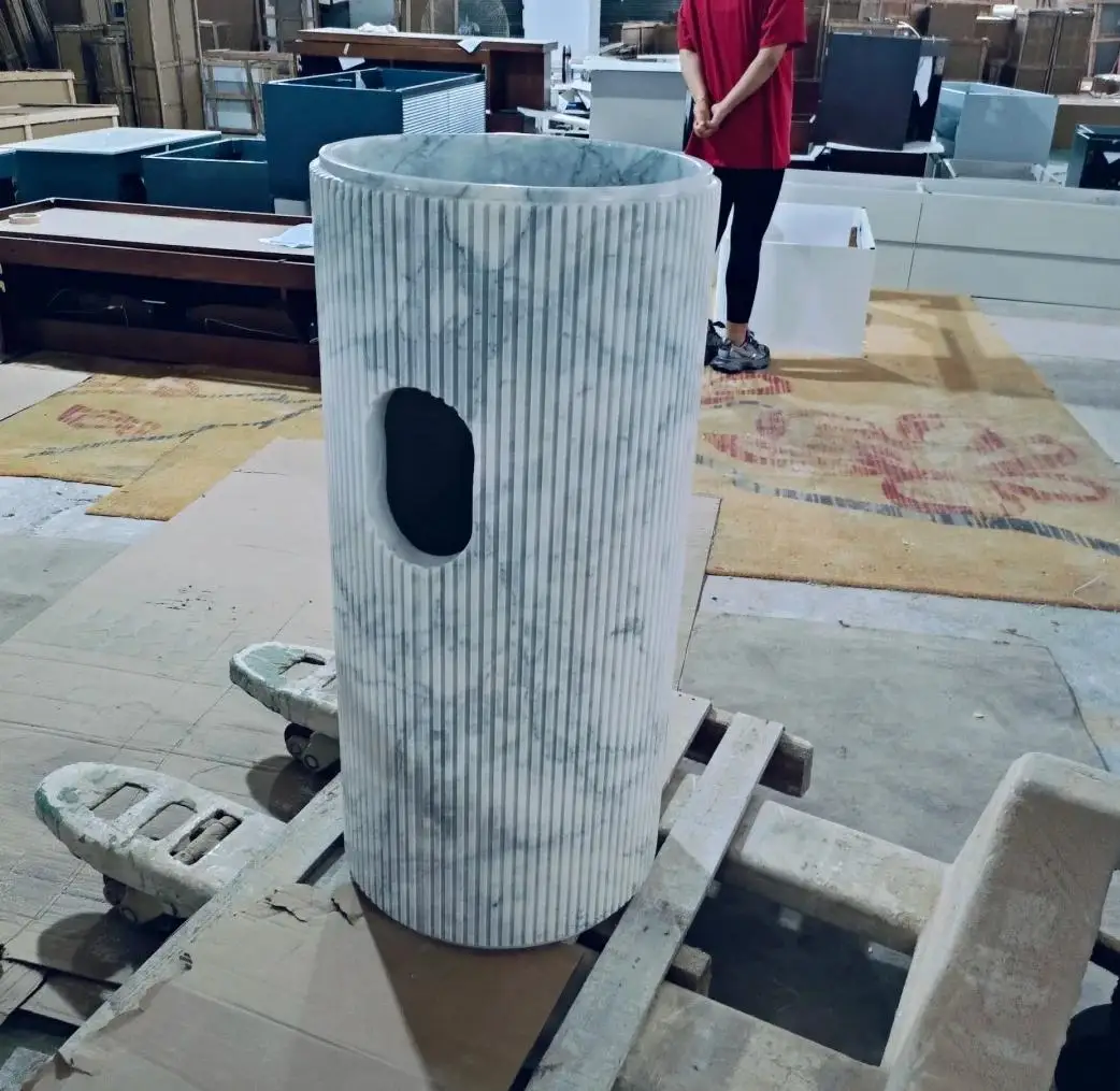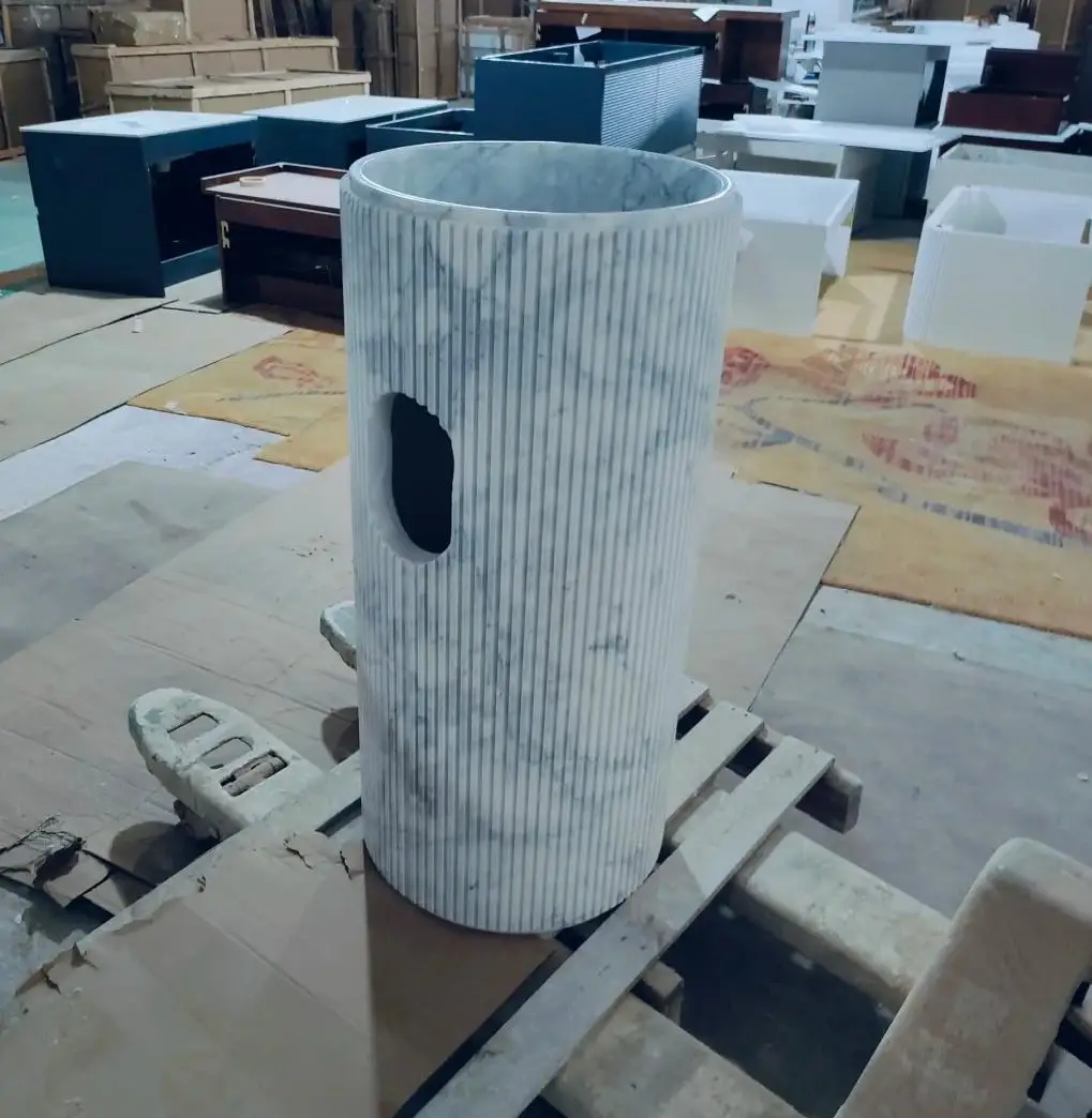 Washbasin modern ta’ marmur naturali Calacatta abjad, bid-disinn ċirkulari uniku tal-groove, imsemmu għall-użu internu fil-baġnu u l-kċina, b’garanzija ta’ 1-sena