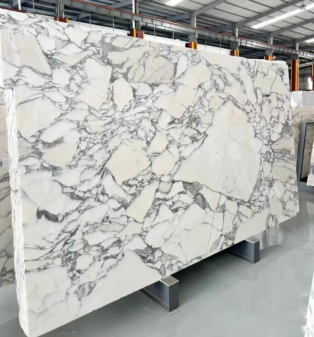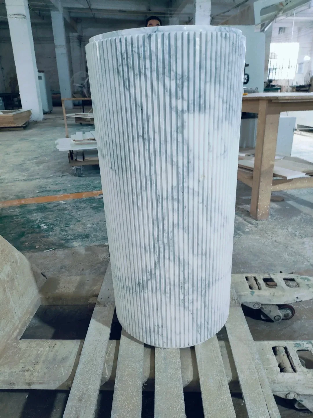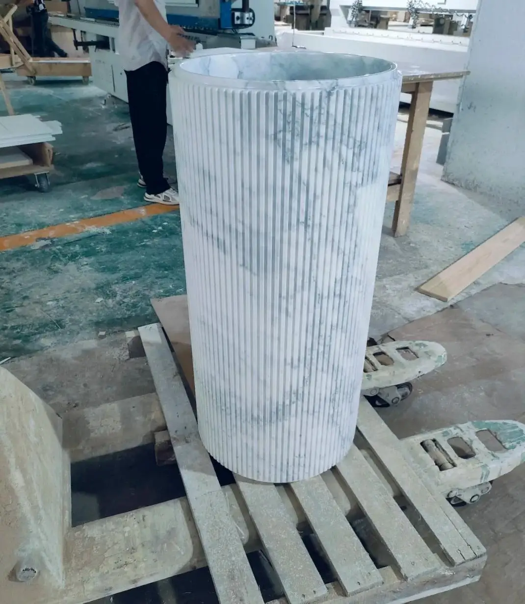 Washbasin modern ta’ marmur naturali Calacatta abjad, bid-disinn ċirkulari uniku tal-groove, imsemmu għall-użu internu fil-baġnu u l-kċina, b’garanzija ta’ 1-sena