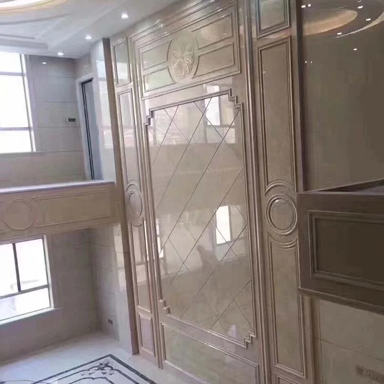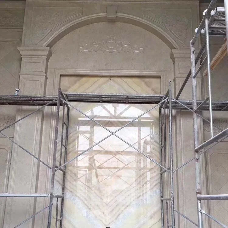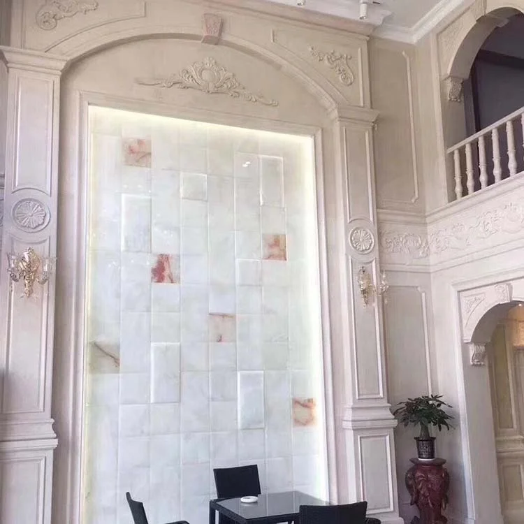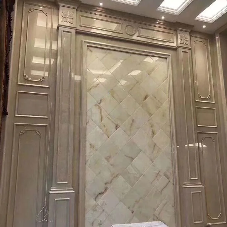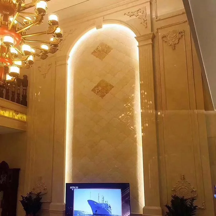 Beżowe płyty marmurowe do willi i domów jednorodzinnych, tło ściany salonu wewnątrz budynku z podświetleniem tylnym