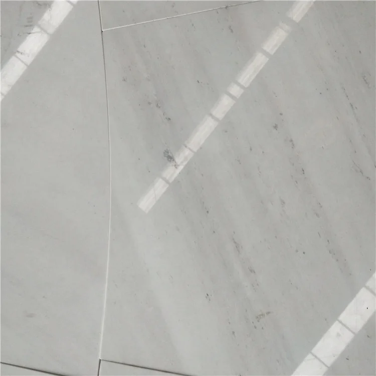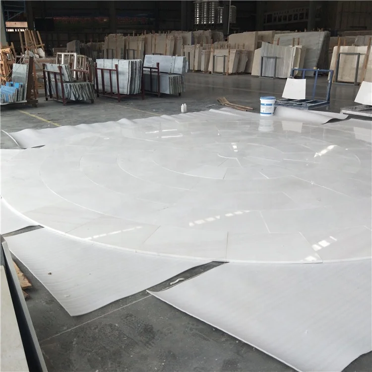 Naturalny kamień do wnętrza holu – biały marmur Aristone z szarymi żyłkami, płytki podłogowe o kształcie łuku cięte strumieniem wody