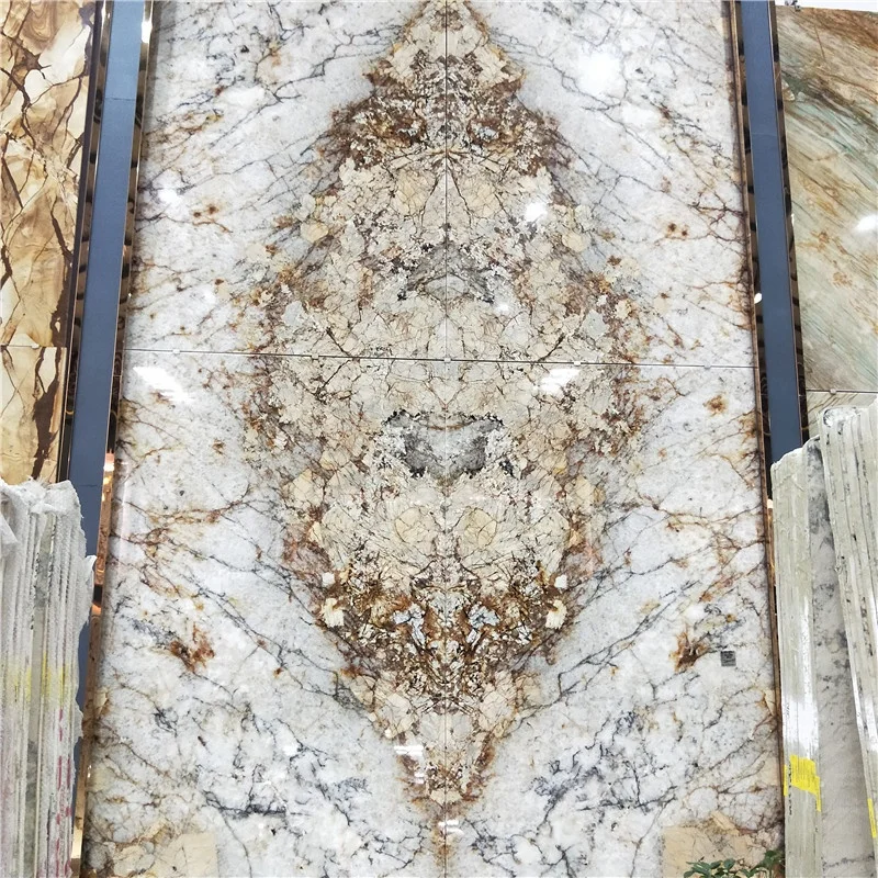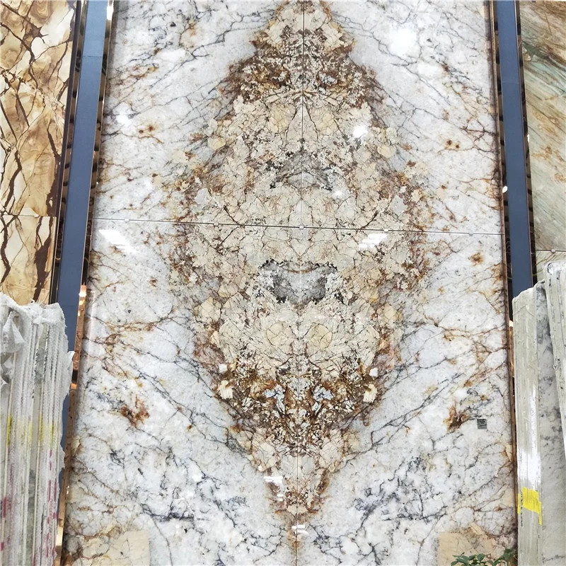 Luksusowe egzotyczne granitowe płyty Alpinus w odcieniach beżu i białego z dopasowaniem książkowym (book match) do projektów zaprojektowania tła w willach