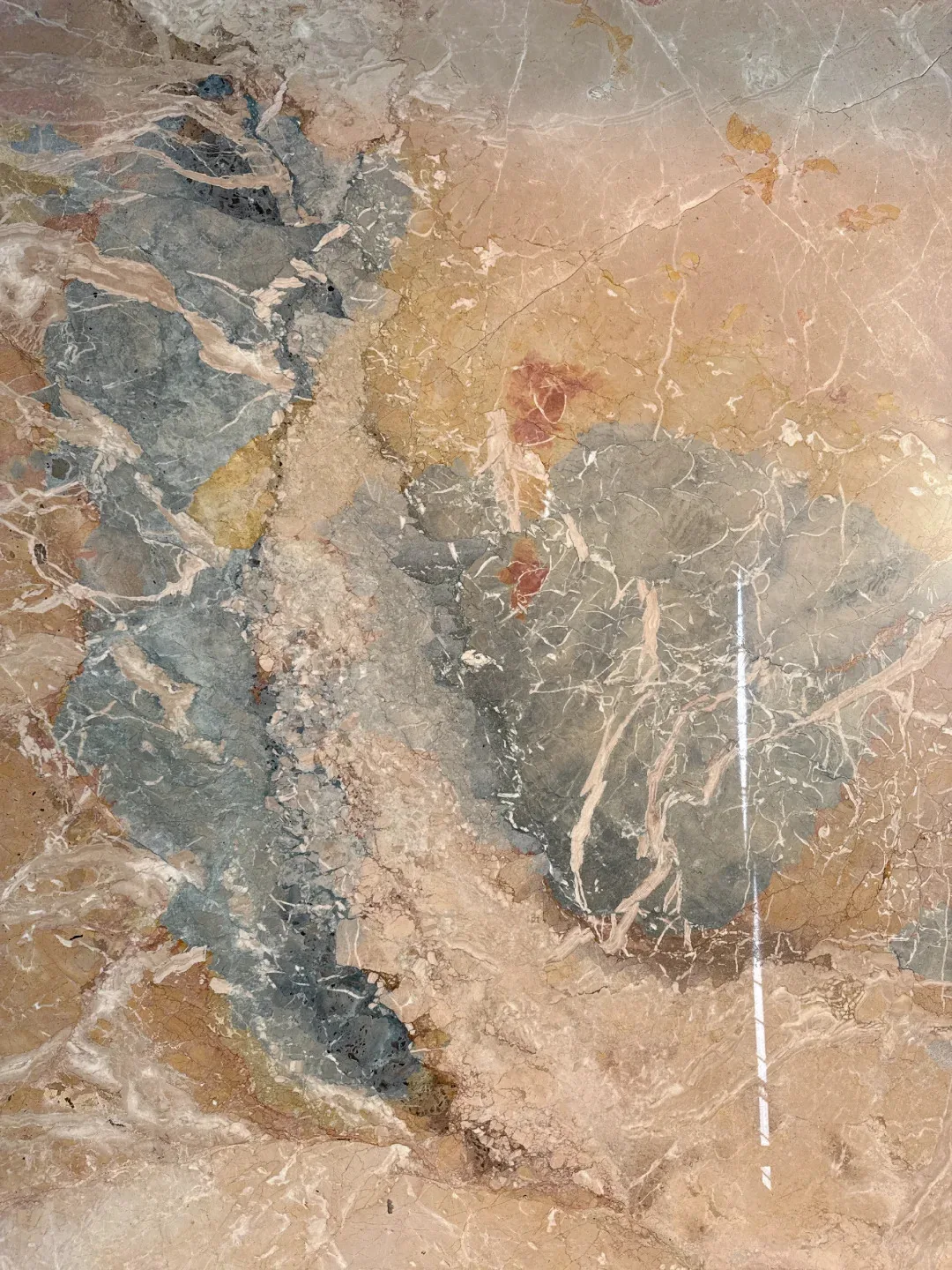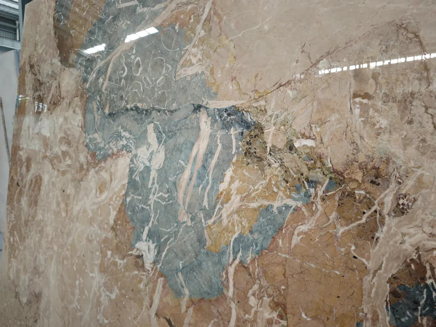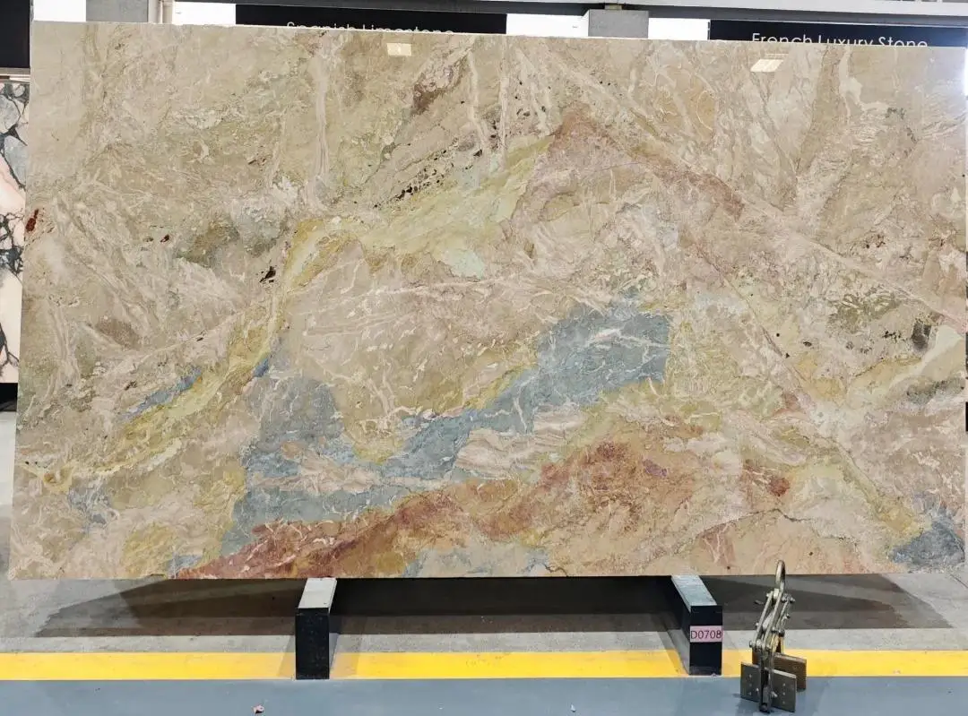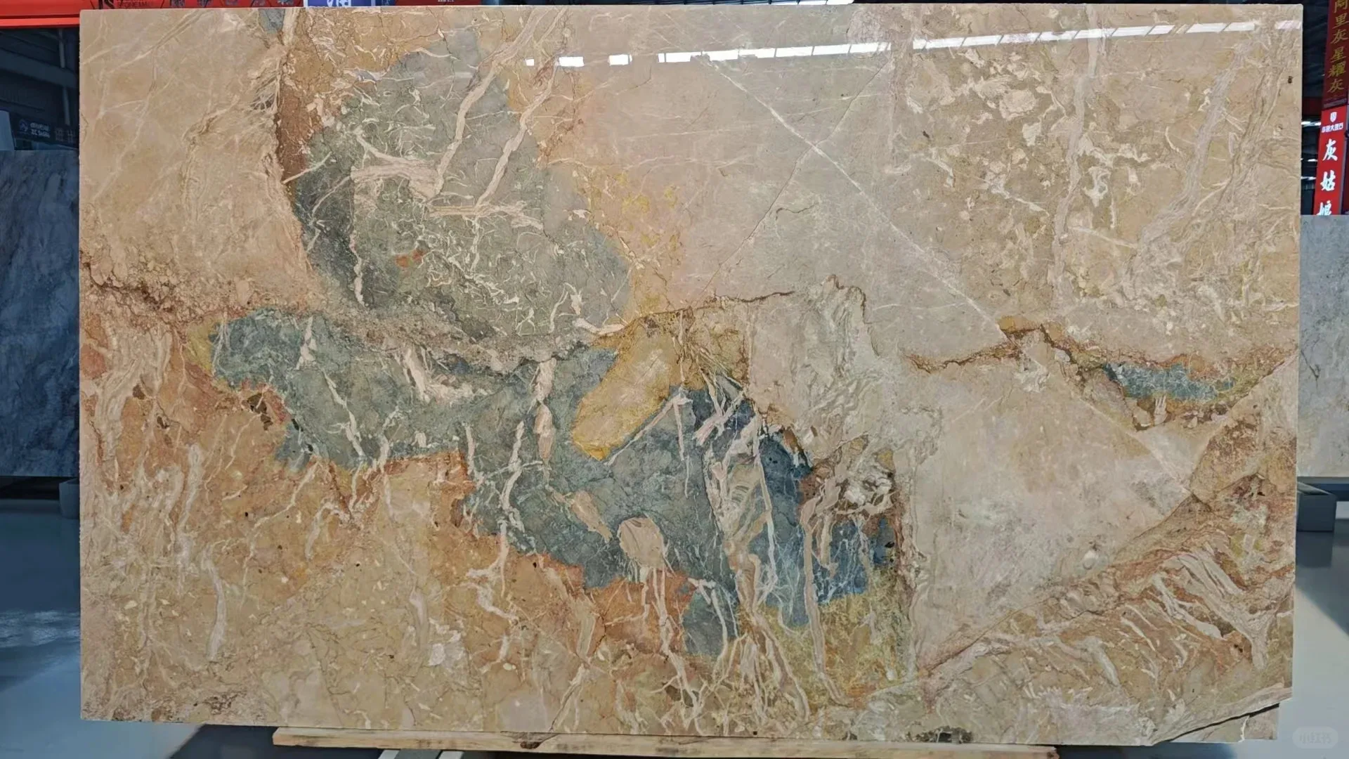 Luksusowe płyty marmurowe w połączeniu odcieni beżowego i niebieskiego – nowoczesne, polerowane, o niestandardowych wymiarach do wnętrz hoteli, muzeów i mieszkań, przeznaczone do projektów dekoracyjnych w pomieszczeniach zamkniętych