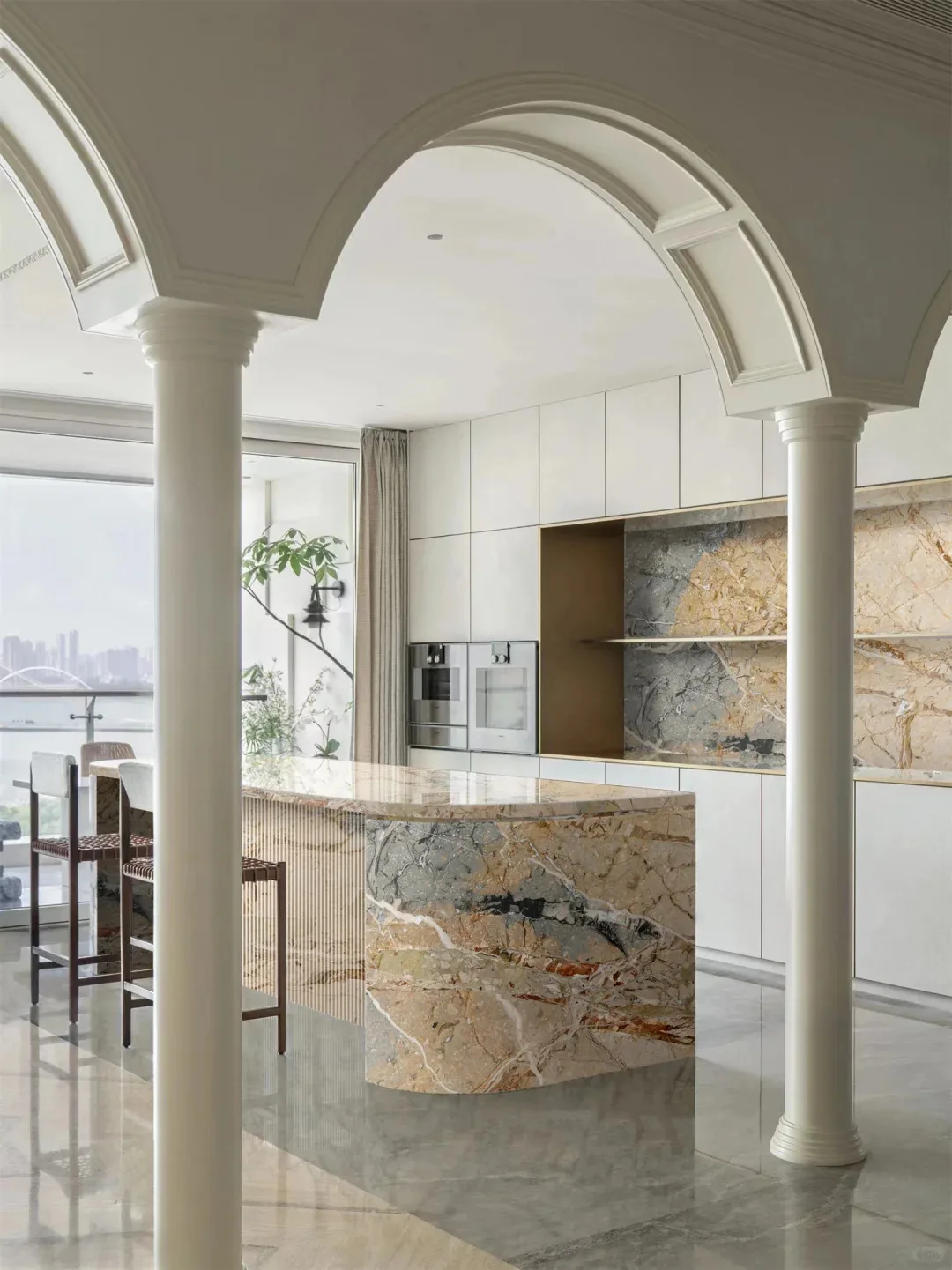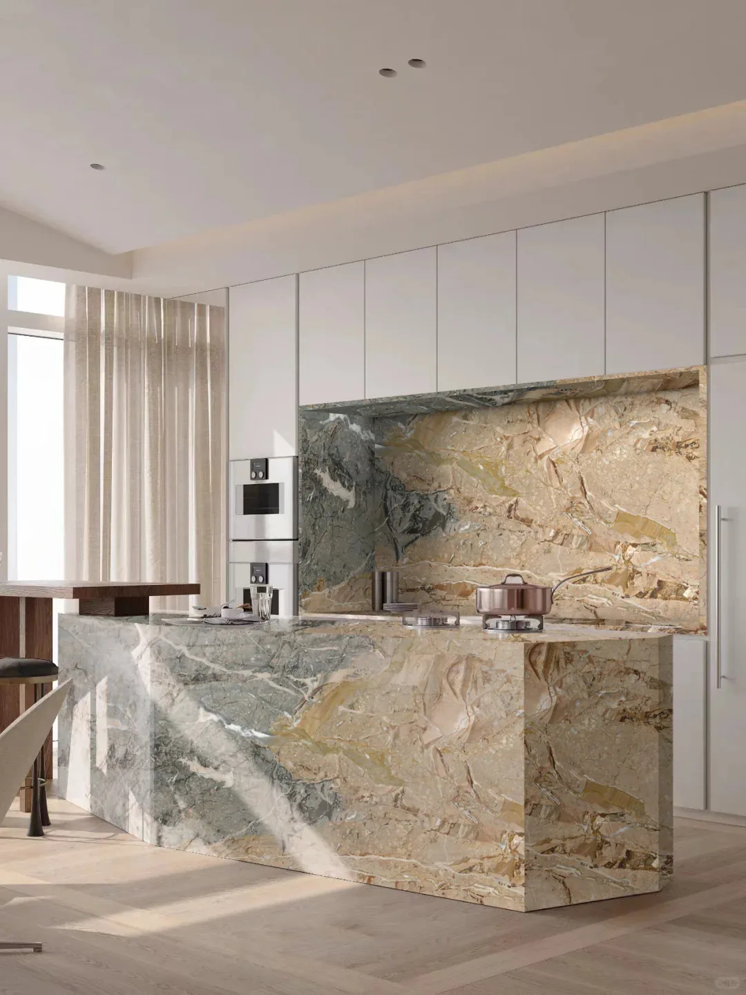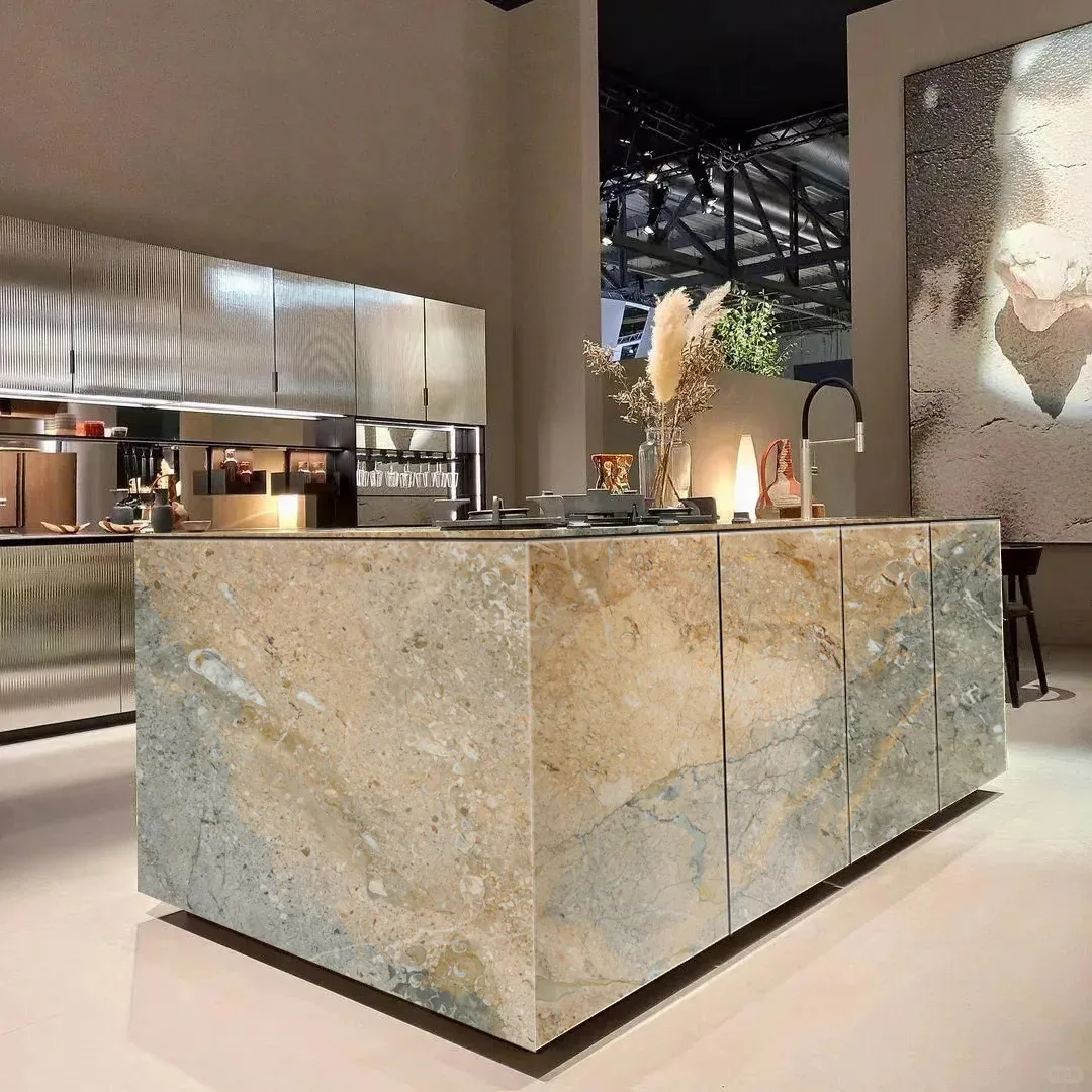 Luksusowe płyty marmurowe w połączeniu odcieni beżowego i niebieskiego – nowoczesne, polerowane, o niestandardowych wymiarach do wnętrz hoteli, muzeów i mieszkań, przeznaczone do projektów dekoracyjnych w pomieszczeniach zamkniętych