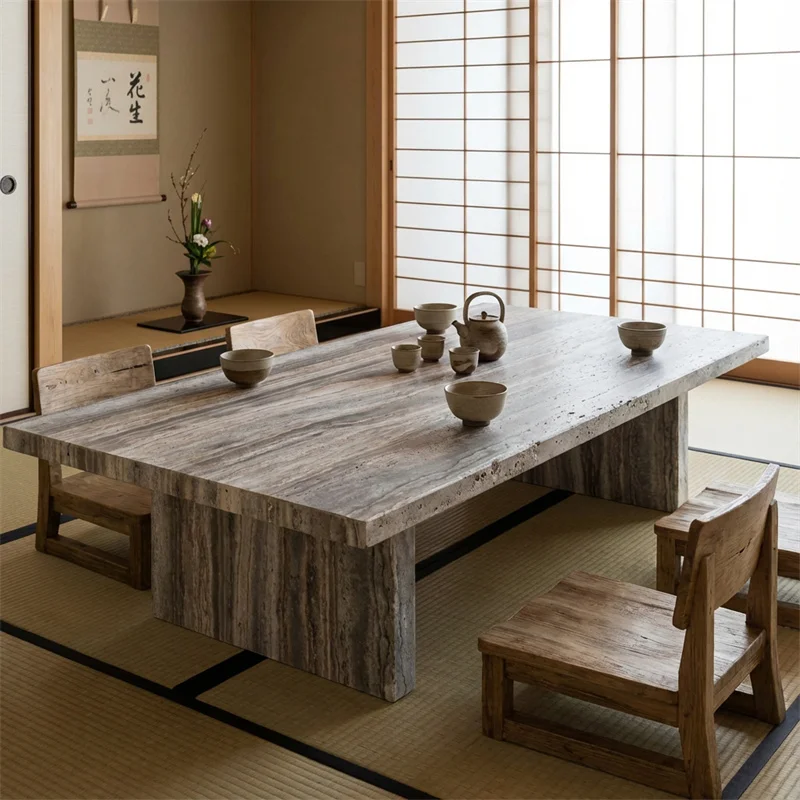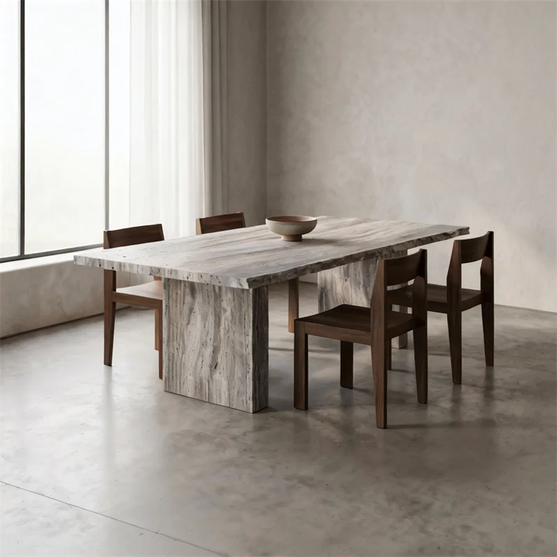 This table embraces the Wabi-Sabi philosophy, which celebrates the beauty in imperfection and the natural aging of materials. The stone’s soft silver tones and natural variegation give it an elegant yet earthy feel, adding character and warmth to your room. Because it’s handcrafted, no two tables look exactly the same, making your space truly special and personalized.