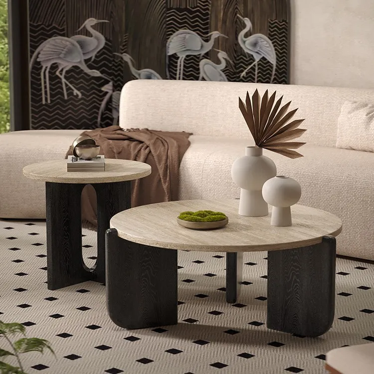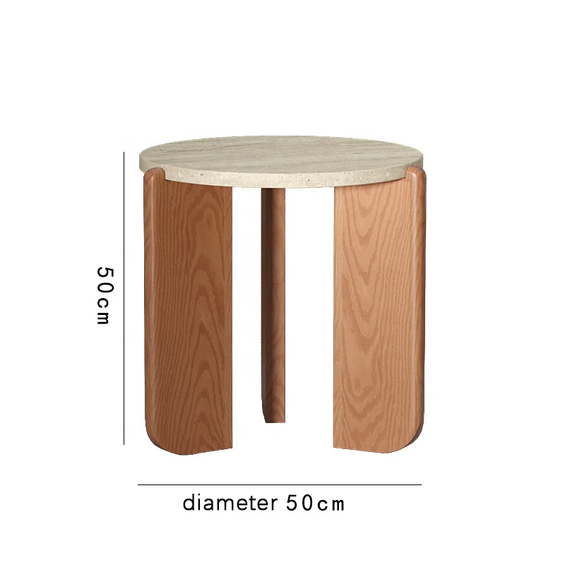 Wabi-Sabi Oak/Birch Travertine Stone Tea Table Minimalist Round Marble Side Furniture for Home Living Room