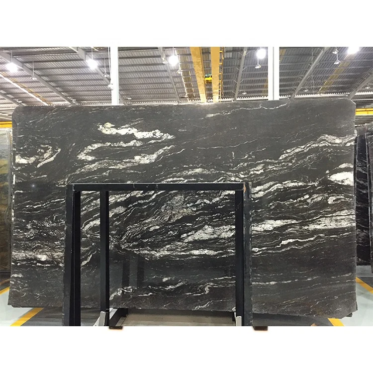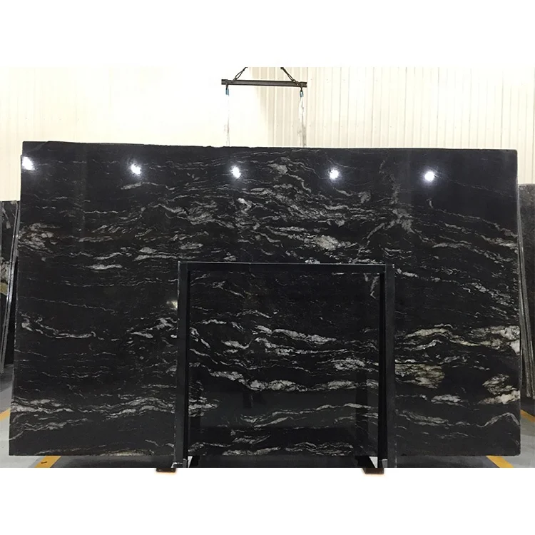 Гранитный блок «Аракруз» черного цвета, черный гранит с белыми волнообразными прожилками, космический черный гранит