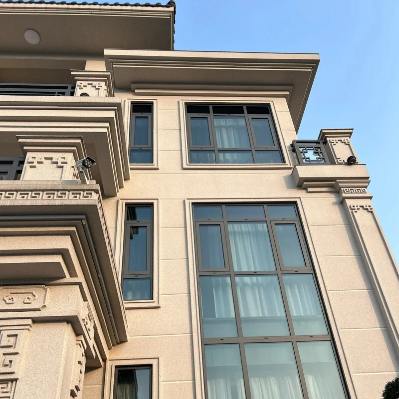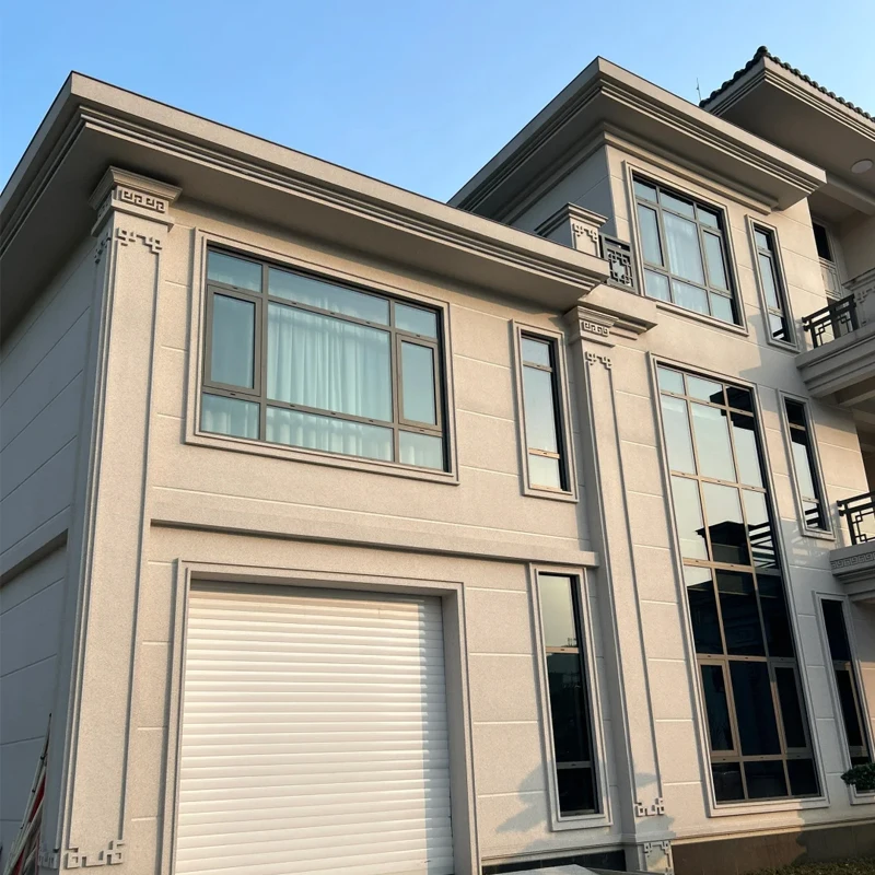 Декоративная облицовка стен роскошной виллы плиткой из желтого песчаника, проект дизайна наружных каменных стен.
