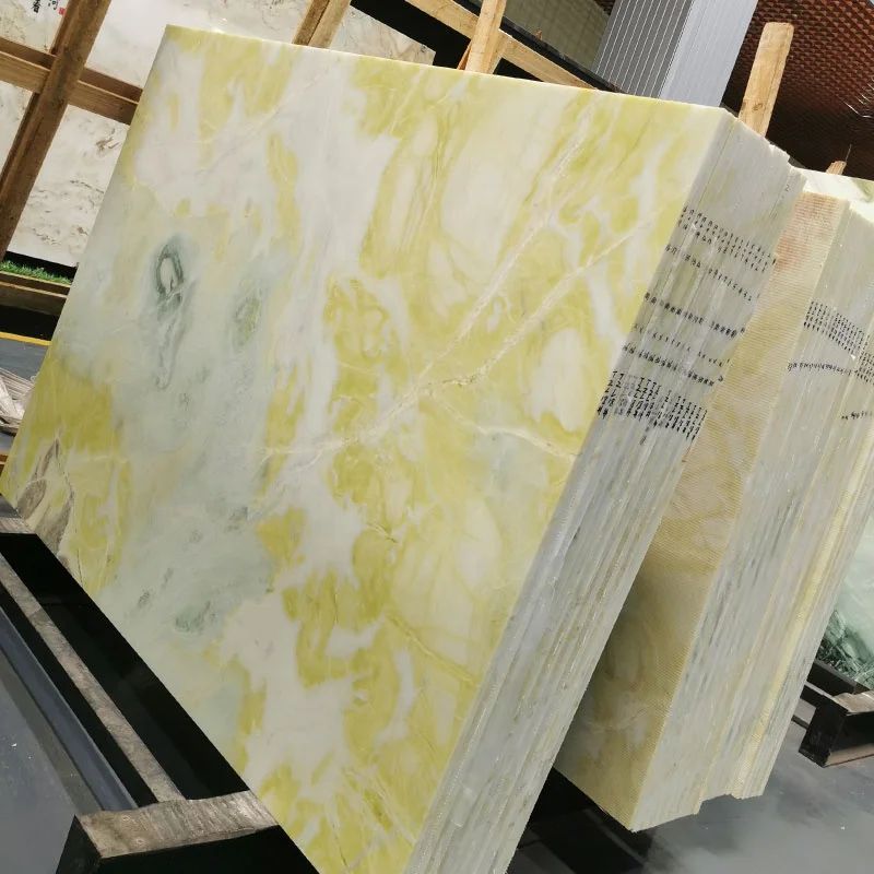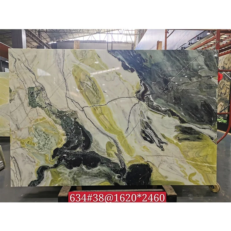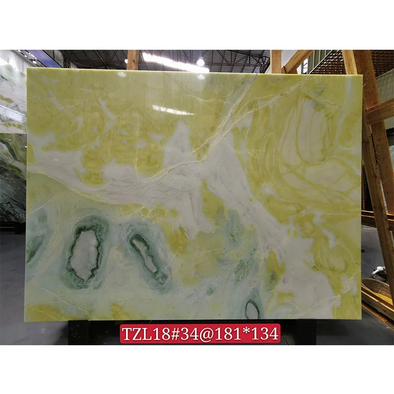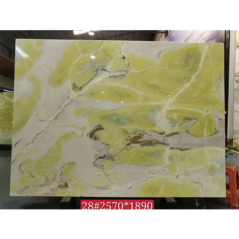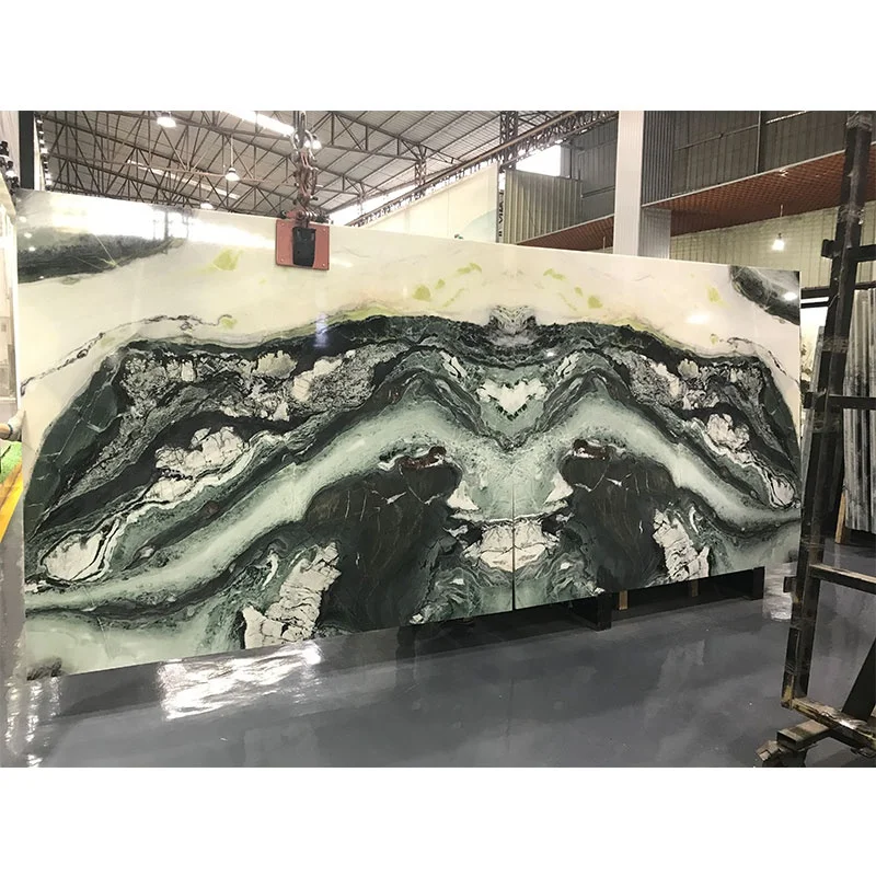 แผ่นหินหนังสือจับคู่ (Book Match Slab) กระเบื้องโอนิกซ์แบบโปร่งแสง หินอ่อนสีเขียวไอร์แลนด์ สำหรับตกแต่งผนังพื้นหลังของวิลลาและโรงแรม