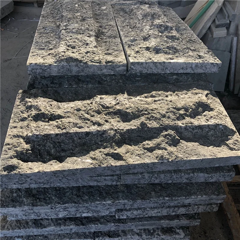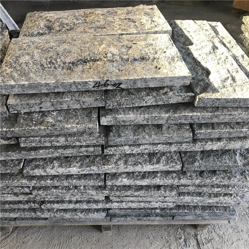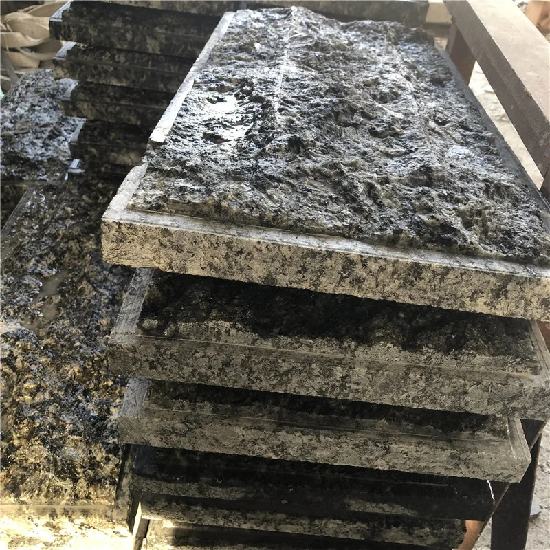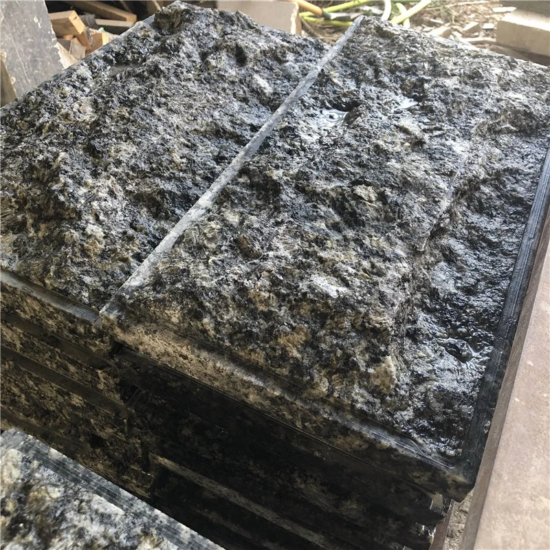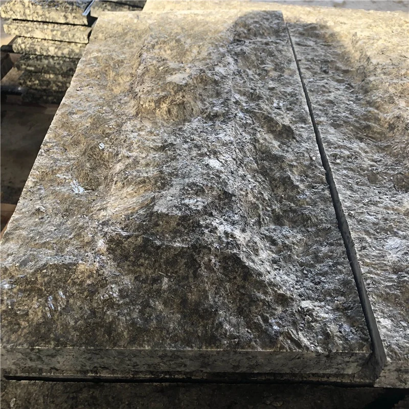 กระเบื้องหินแกรนิตสีเขียวมะกอกแบบธรรมชาติ ผิวหยาบแบบแยกหน้า (Split Face) สำหรับงานหุ้มผนังภายนอกอาคาร ใช้ในโครงการออกแบบและตกแต่งอาคารภายนอก